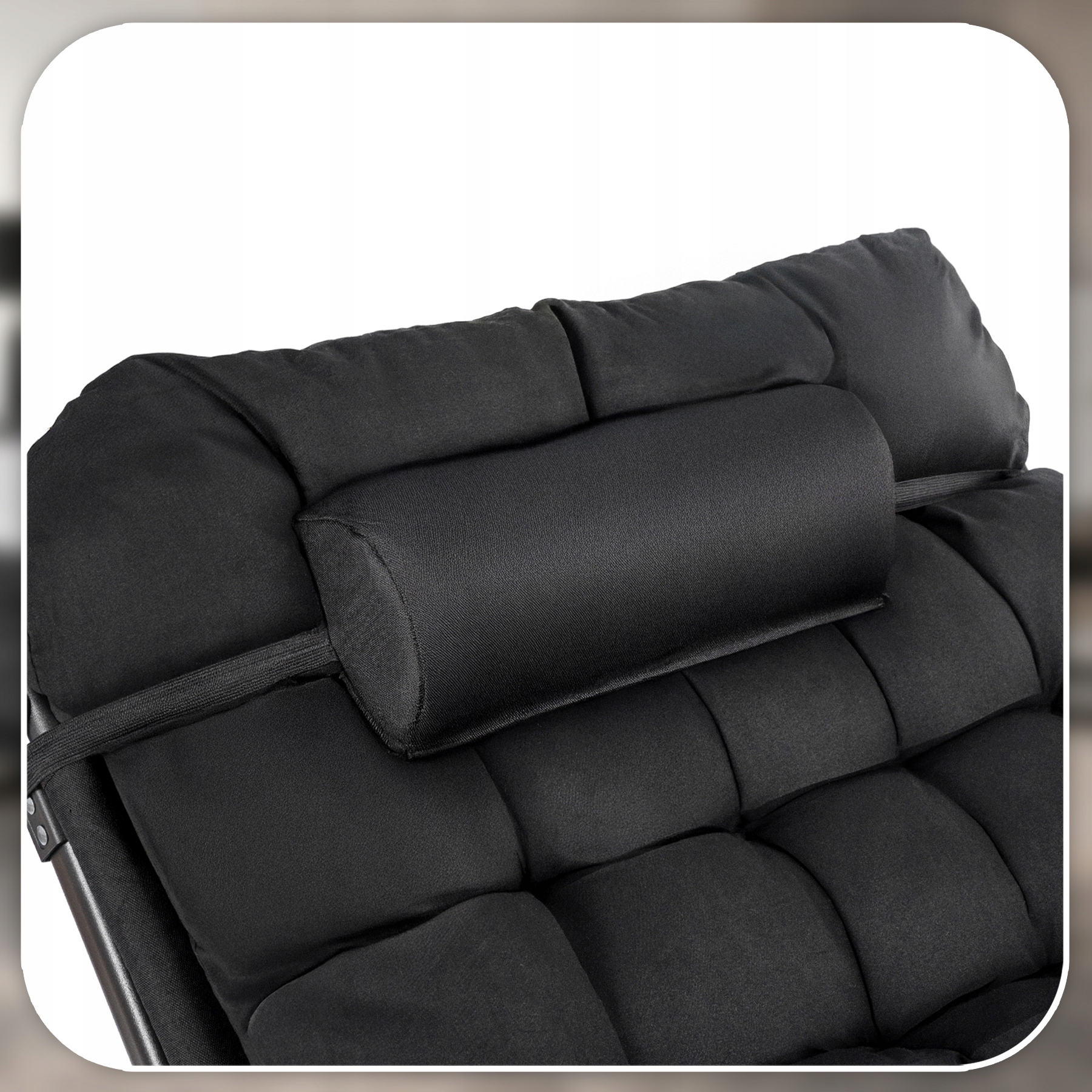Miękki zagłówek zapewnia wygodne podparcie głowy i karku, zwiększając komfort podczas wypoczynku. Dzięki regulowanemu mocowaniu można łatwo dopasować jego położenie do indywidualnych potrzeb użytkownika.