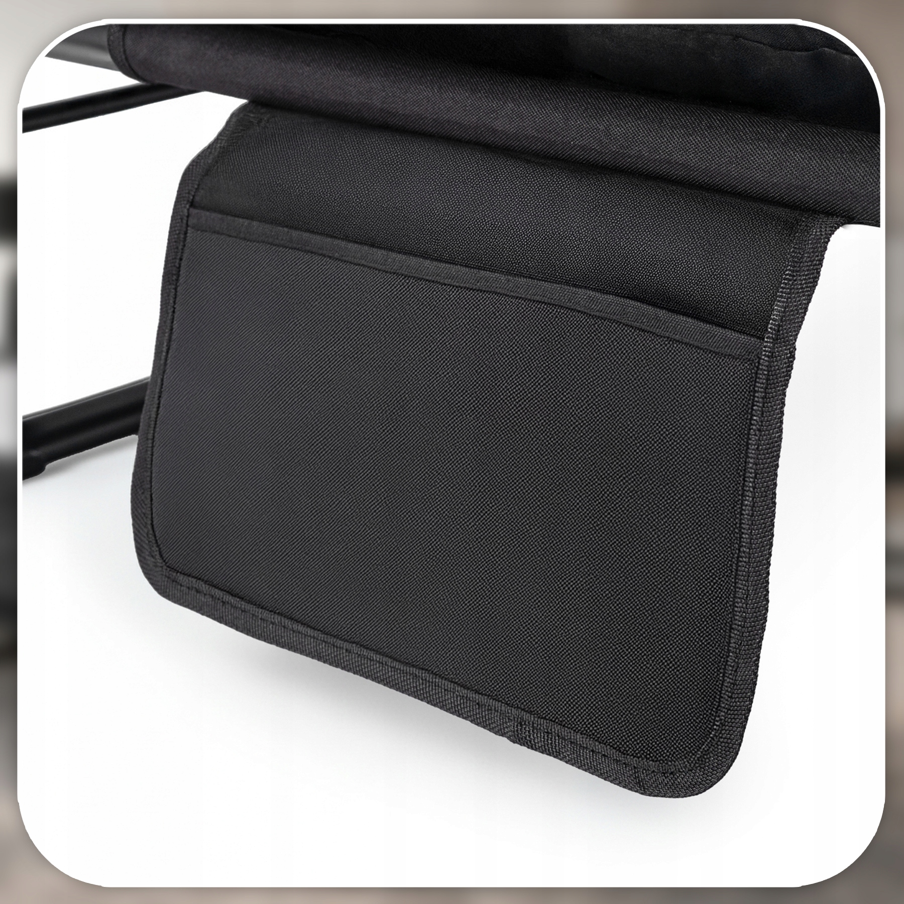 Kieszonka zamocowana przy stelażu zapewnia łatwy dostęp do niezbędnych przedmiotów, takich jak książka, pilot czy telefon, bez potrzeby schylania się czy wstawania. Wykonana z trwałej tkaniny odpornej na rozciąganie, bezpiecznie pomieści drobne akcesoria podczas relaksu.