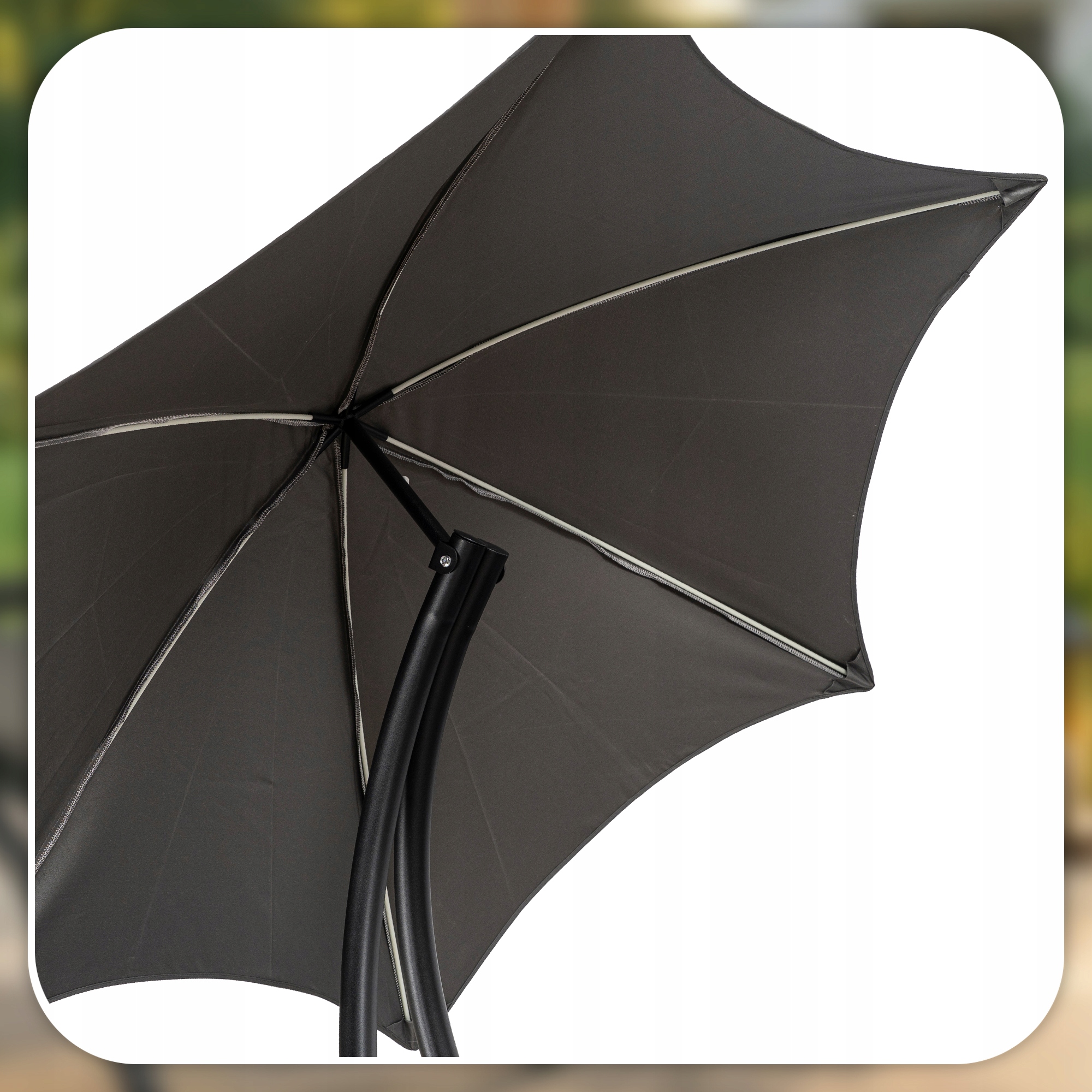 - Zintegrowany parasol – praktyczny daszek skutecznie chroni przed intensywnym słońcem.