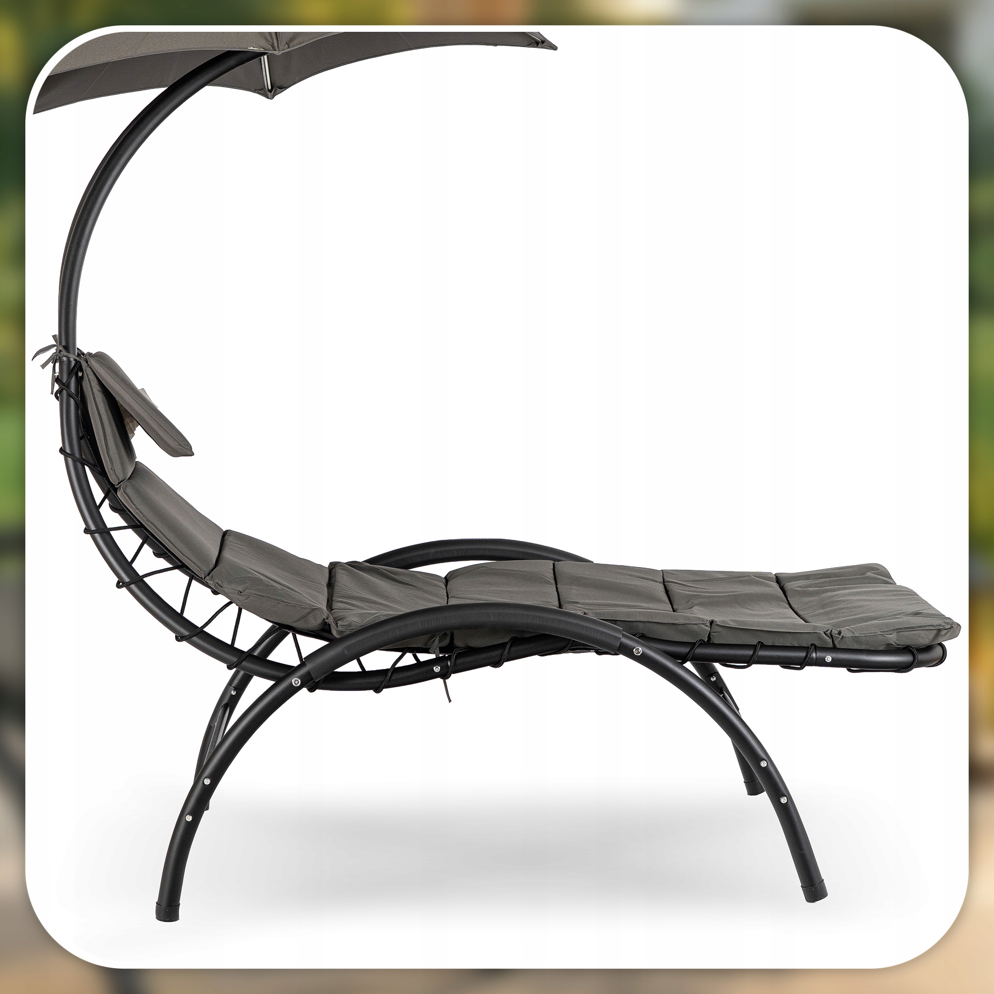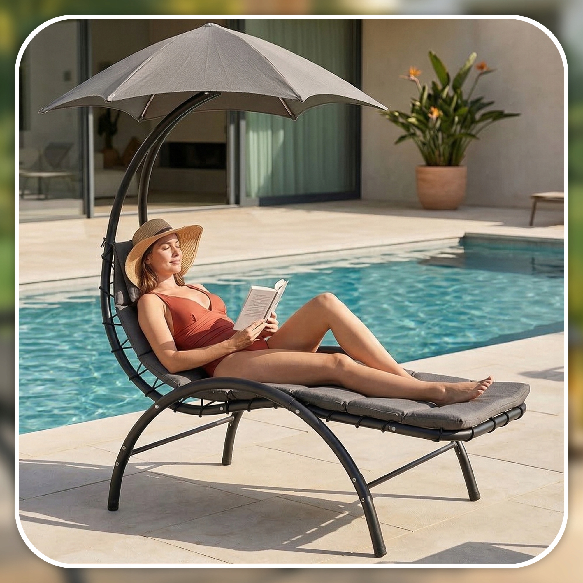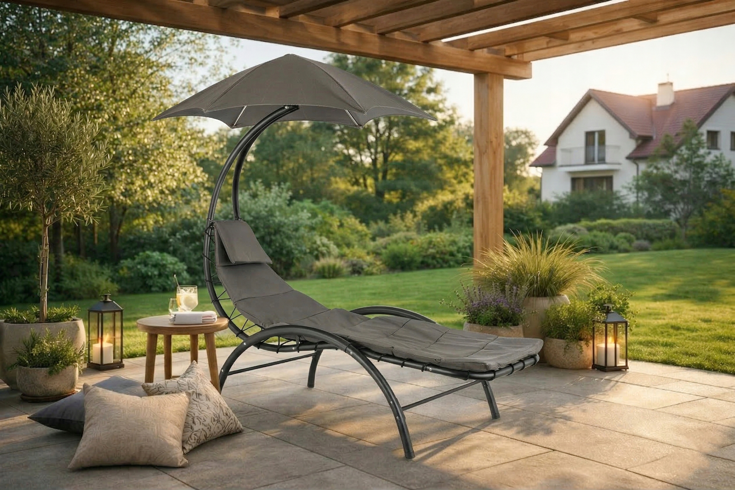 - Przy basenie – parasol zapewnia przyjemny cień, a kształt leżaka pozwala komfortowo odpoczywać podczas słonecznych dni.