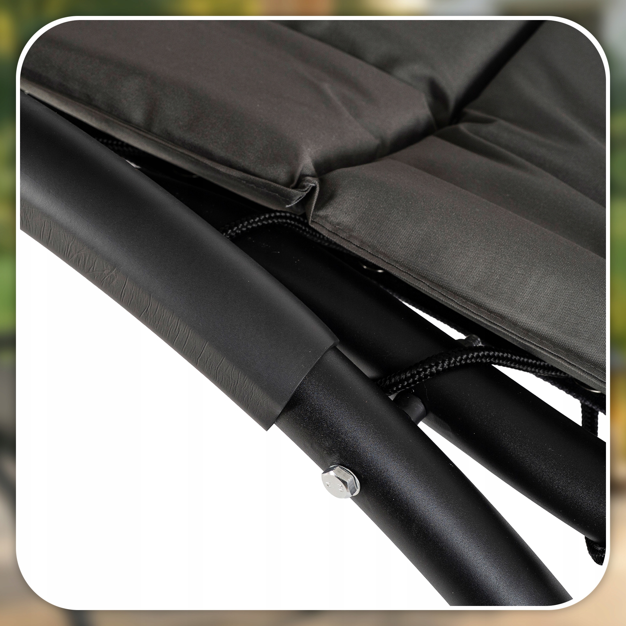 - Solidny metalowy stelaż – stabilna konstrukcja z wytrzymałej stali gwarantuje trwałość, bezpieczeństwo oraz odporność.