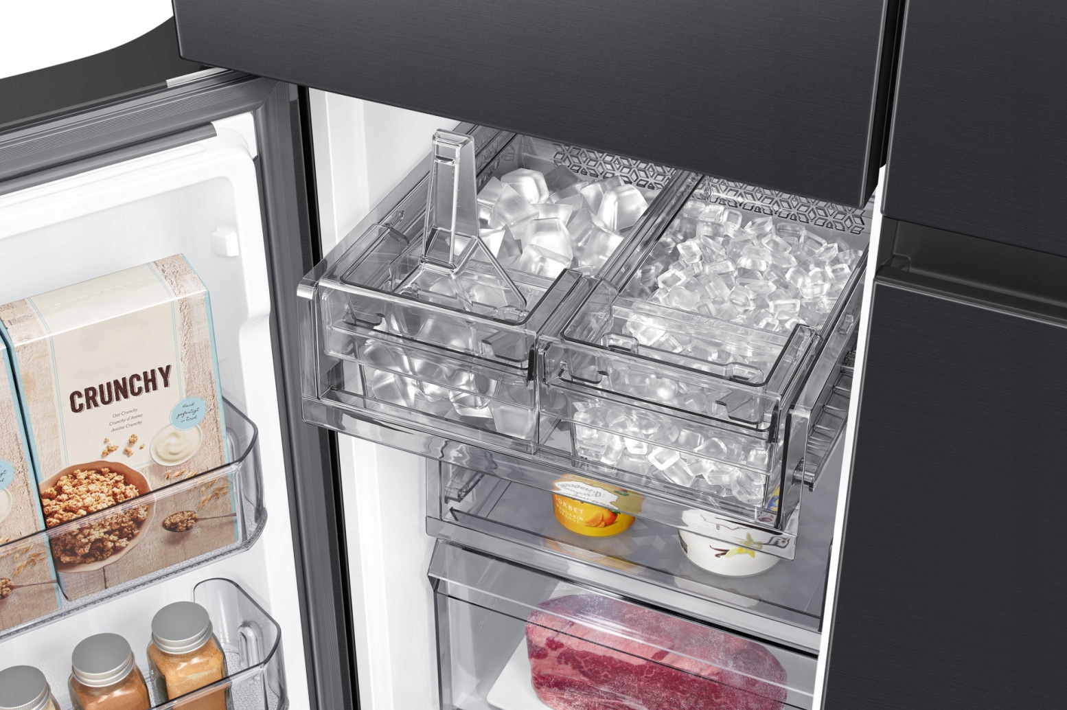 Teraz masz pewność, że jesteś przygotowany na każdą okazję dzięki dwóm rodzajom lodu. Dual Auto Ice Maker wytwarza zarówno lód w standardowych kostkach, jak i w mniejszych Ice Bites™, które znacznie szybciej schładzają napoje. Może wyprodukować do 2,3 kg lodu dziennie i przechowywać do 4,1 kg*. Dzięki temu, że znajduje się w zamrażarce, nie zajmuje miejsce w lodówce.