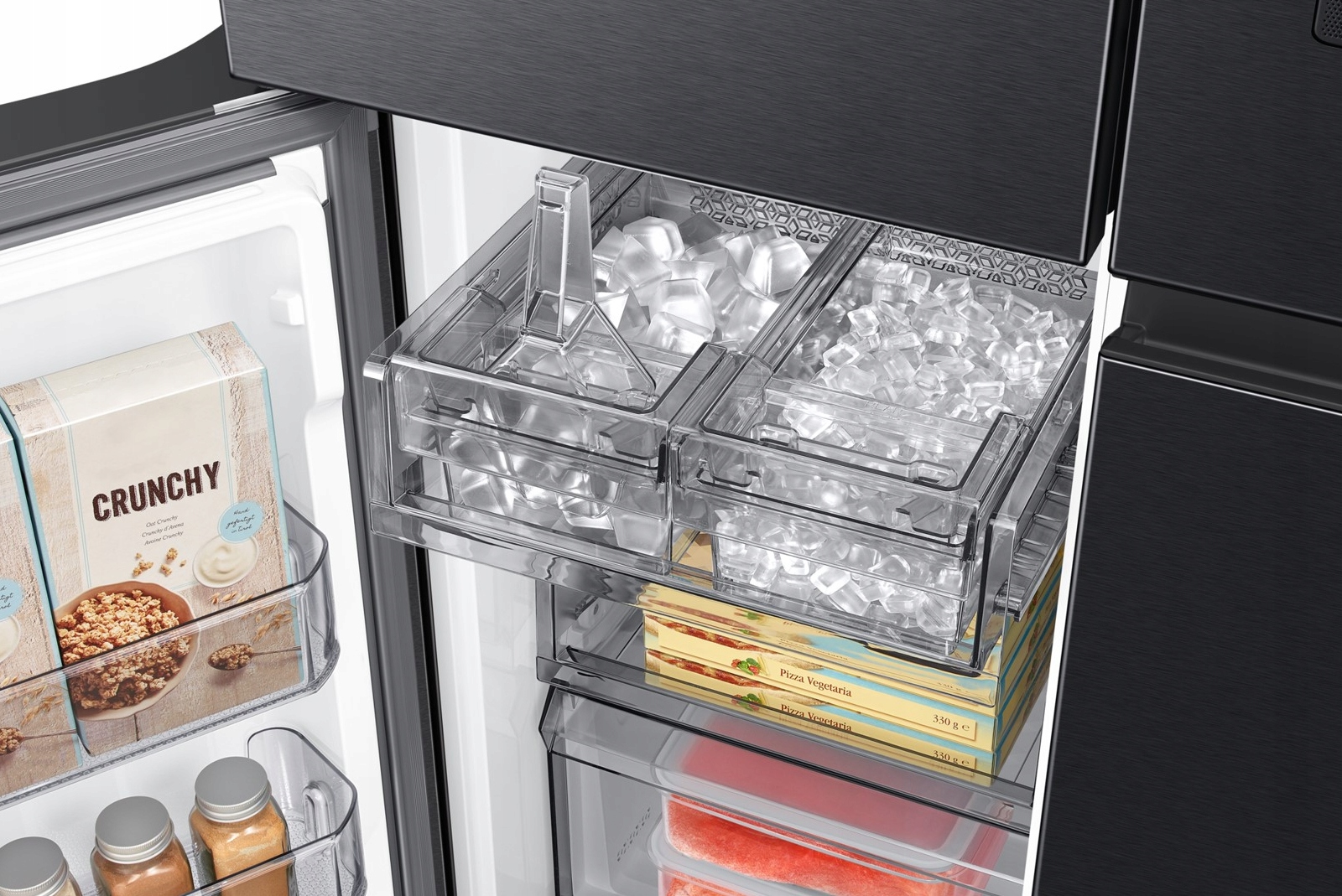Teraz masz pewność, że jesteś przygotowany na każdą okazję dzięki dwóm rodzajom lodu. Dual Auto Ice Maker wytwarza zarówno lód w standardowych kostkach, jak i w mniejszych Ice Bites™, które znacznie szybciej schładzają napoje. Może wyprodukować do 2,3 kg lodu dziennie i przechowywać do 4,1 kg*. Dzięki temu, że znajduje się w zamrażarce, nie zajmuje miejsce w lodówce.