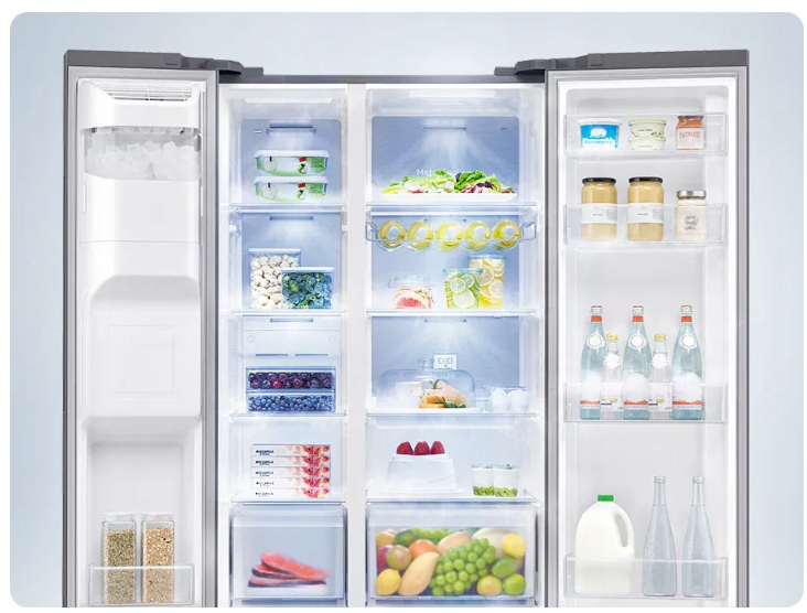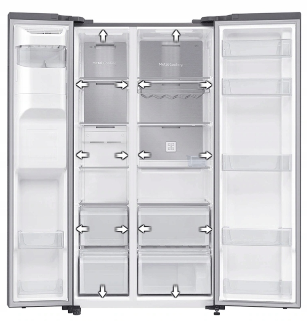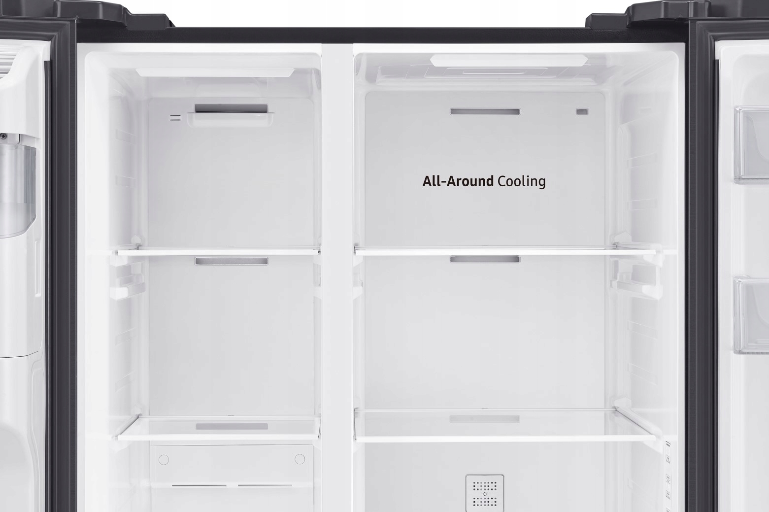 System All-Around Cooling równomiernie chłodzi każdą część lodówki. Zimne powietrze wdmuchiwane jest przez otwory wentylacyjne umieszczone na kilku poziomach, dzięki czemu temperatura wewnątrz jest stabilna, a jedzenie dłużej pozostaje świeże.