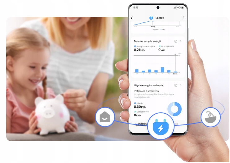Zarządzaj swoim zużyciem energii, aby ograniczyć ślad węglowy i obniżyć rachunki za prąd. SmartThings Energy* daje wskazówki dotyczące efektywności energetycznej, w czasie rzeczywistym monitoruje zużycie energii** oraz porównuje je z poprzednim miesiącem. I ostrzega Cię, kiedy Twoje miesięczne założenia mogą zostać przekroczone.