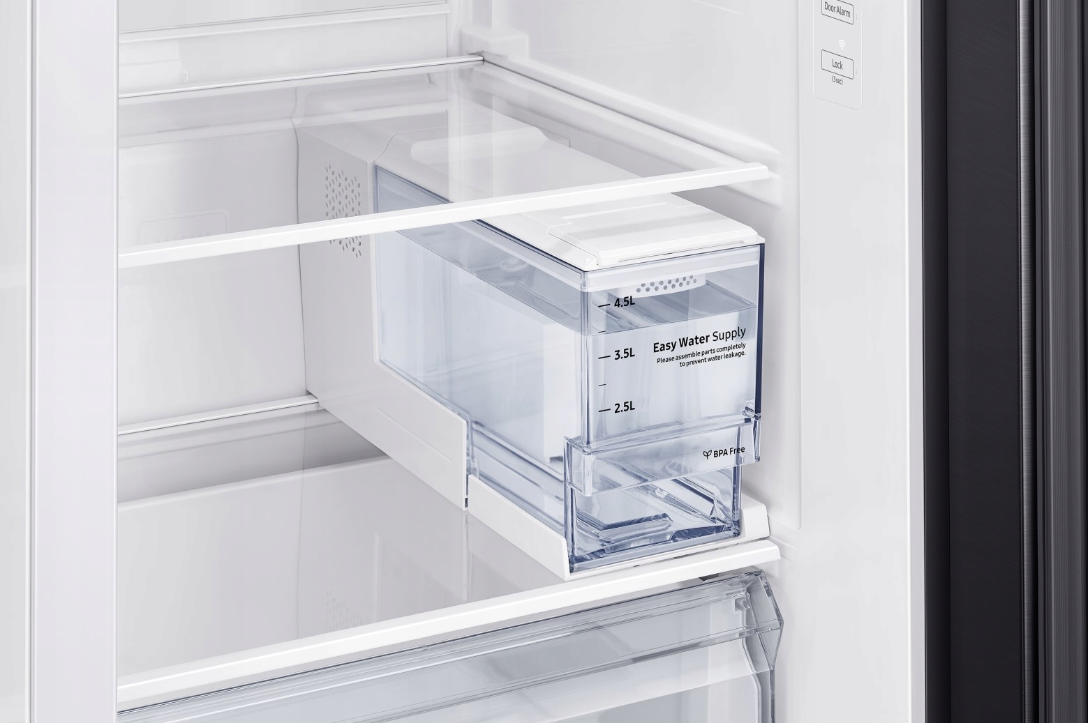 W przypadku tej lodówki masz możliwość montażu jej bez podłączenia hydraulicznego. Posiada bowiem ona niewymagający hydrauliki oraz wolny od bisfenolu A* pojemnik na wodę.