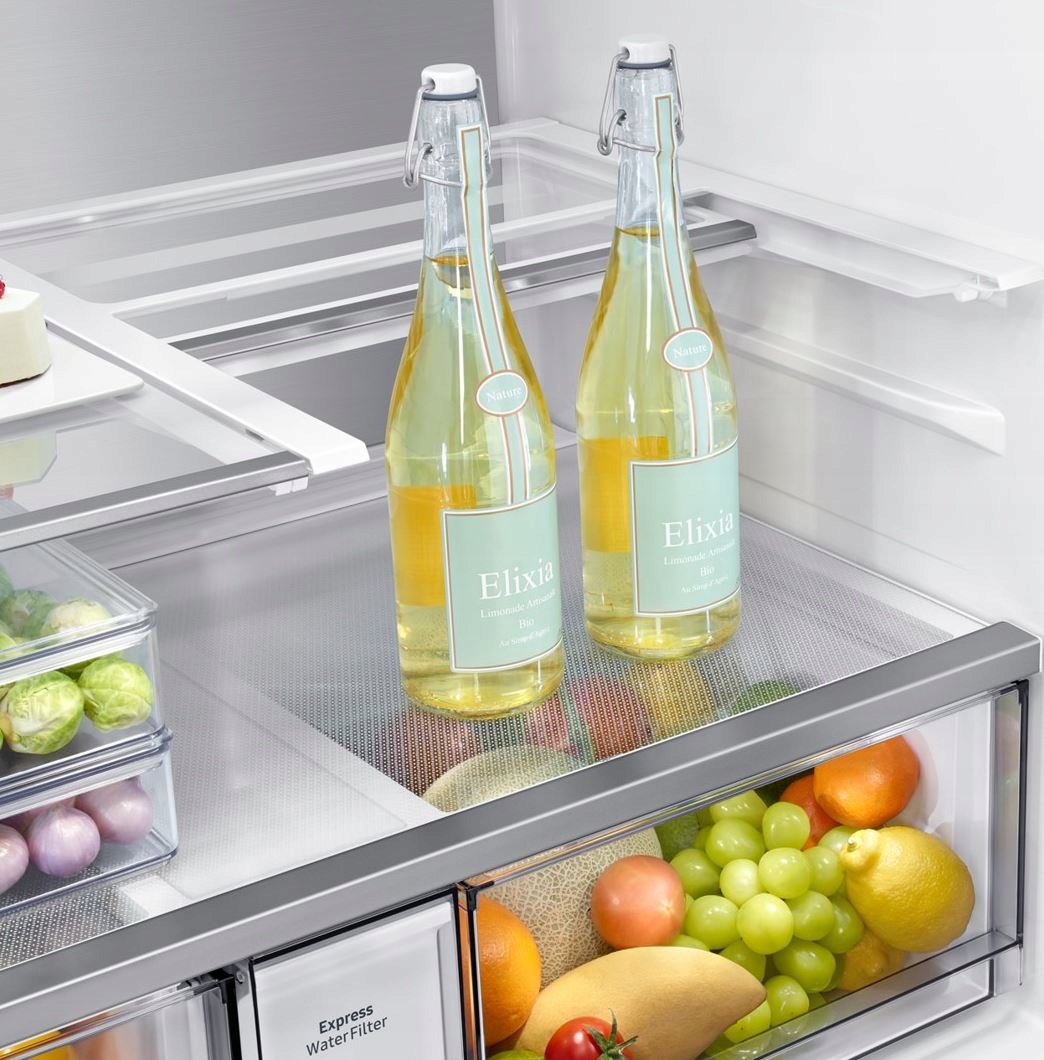 Możesz elastycznie wykorzystywać przestrzeń lodówki, aby wygodnie przechowywać duże i nieporęczne przedmioty. Wsuwana półka zajmuje połowę szerokości lodówki i można ją przesunąć do tyłu, aby uzyskać więcej miejsca na wysokie butelki, niestandardowe pojemniki czy duże produkty, takie jak np. wielopoziomowy tort.