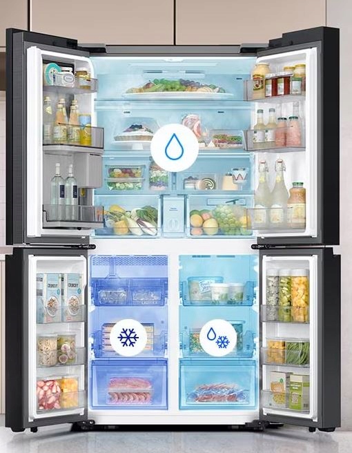 Dłużej ciesz się świeżością jedzenia, zachowując jego aromat i walory smakowe. Niezależny system chłodzenia Triple Cooling dostarcza chłodne powietrze do 3 komór w lodówce i zamrażarce. Utrzymuje optymalną temperaturę i wilgotność w każdej z nich i zapobiega mieszaniu się zapachów.