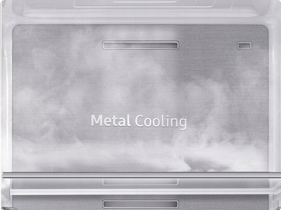 Technologia ta utrzymuje optymalną temperaturę wewnątrz lodówki, dzięki czemu żywność pozostaje świeża nawet przy częstym otwieraniu i zamykaniu drzwi. Metalowa płyta chłodząca Metal Cooling i specjalny płaski panel tylnej ścianki zatrzymują zimno wewnątrz i pomagają przywrócić niską temperaturę. Dodatkowo nadają lodówce elegancki wygląd i są łatwe do czyszczenia.