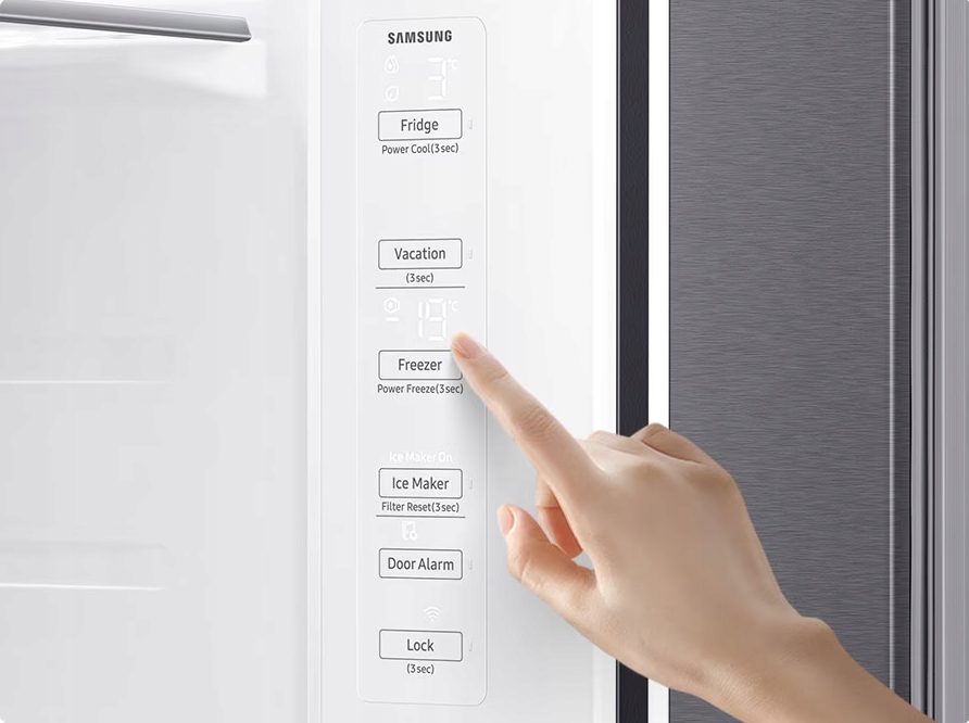 Ciesz się szybkim chłodzeniem. Po naciśnięciu przycisku funkcja Power Cool wdmuchuje strumień bardzo zimnego powietrza do lodówki, aby szybko schłodzić artykuły spożywcze lub ulubione napoje. Funkcja Power Freeze zapewnia intensywny nadmuch zimnego powietrza do zamrażarki, co świetnie sprawdza się podczas głębokiego zamrażania produktów i wytwarzania lodu.
