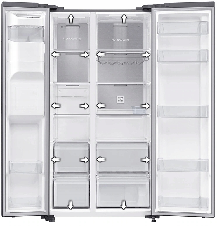 System All-Around Cooling równomiernie chłodzi każdą część lodówki. Zimne powietrze wdmuchiwane jest przez otwory wentylacyjne umieszczone na kilku poziomach, dzięki czemu temperatura wewnątrz jest stabilna, a jedzenie dłużej pozostaje świeże.