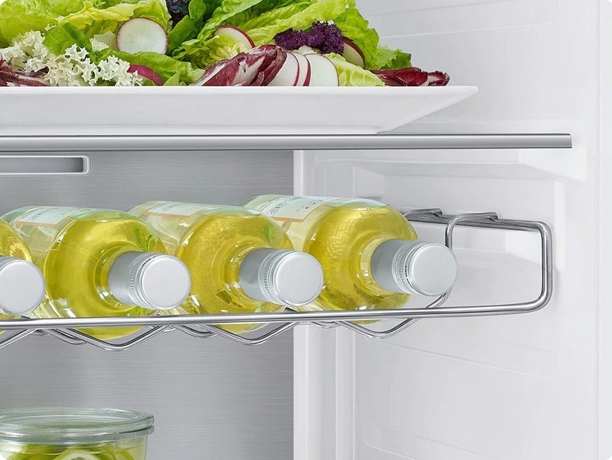 Uporządkuj swoje zapasy i bezpiecznie przechowuj więcej wina. Łatwo dostępna półka na wino została zaprojektowana tak, aby umożliwić umieszczenie butelek o niestandardowych rozmiarach i kształtach. Można ją zainstalować w górnej lub dolnej komorze. Teraz ciesz się kieliszkiem pysznie schłodzonego wina, kiedy tylko chcesz.