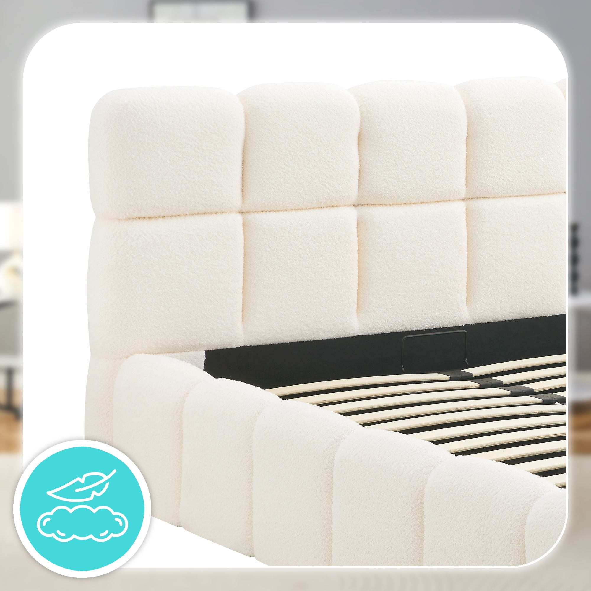 Łóżko zostało obite wyjątkowo przyjemną w dotyku tkaniną teddy, która nie tylko podkreśla elegancki charakter mebla, ale także dodaje mu ciepła i przytulności. Jej barankowa, miękka faktura sprawia, że codzienny odpoczynek staje się jeszcze bardziej komfortowy, a sypialnia zyskuje stylowy i nowoczesny wygląd.