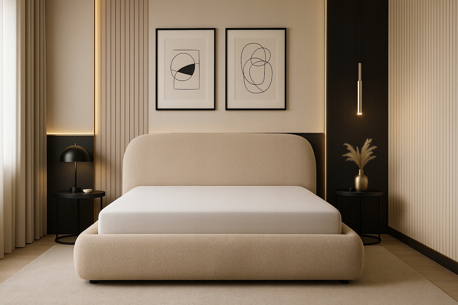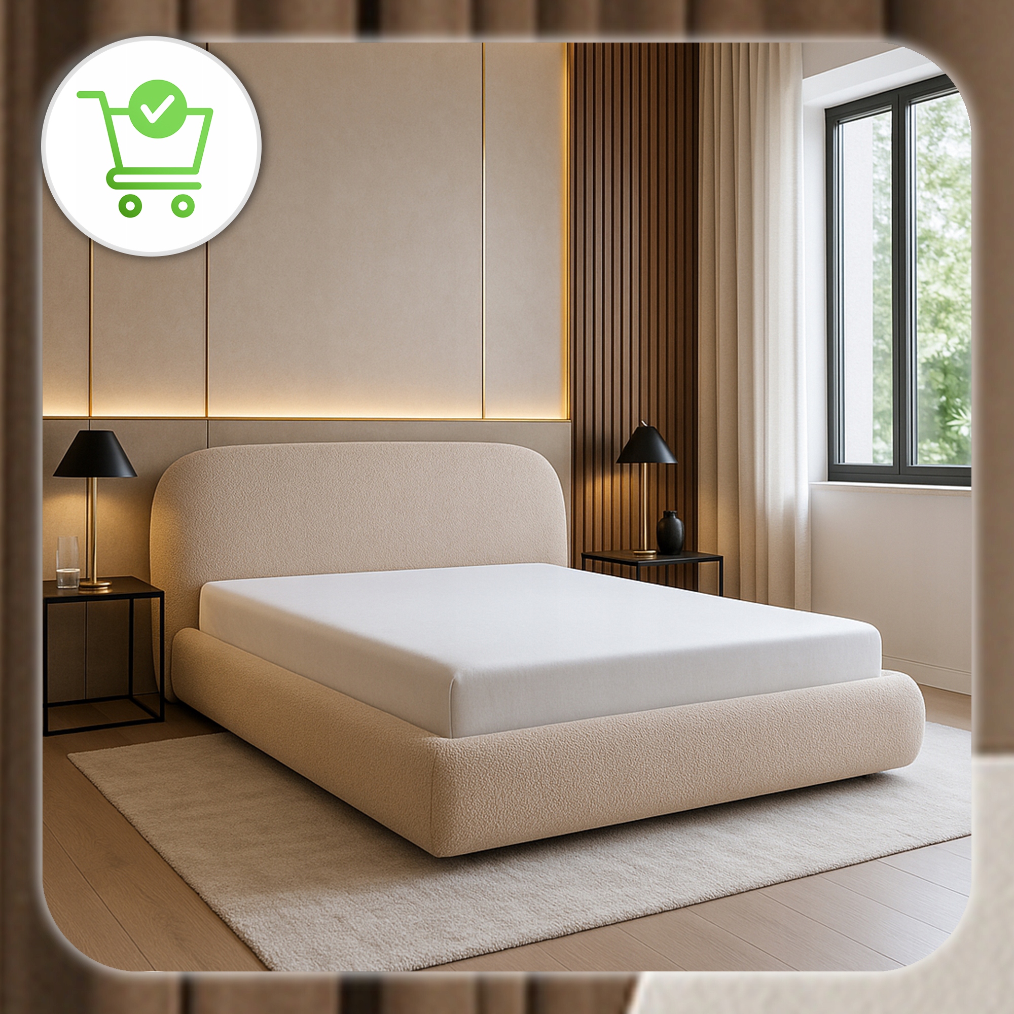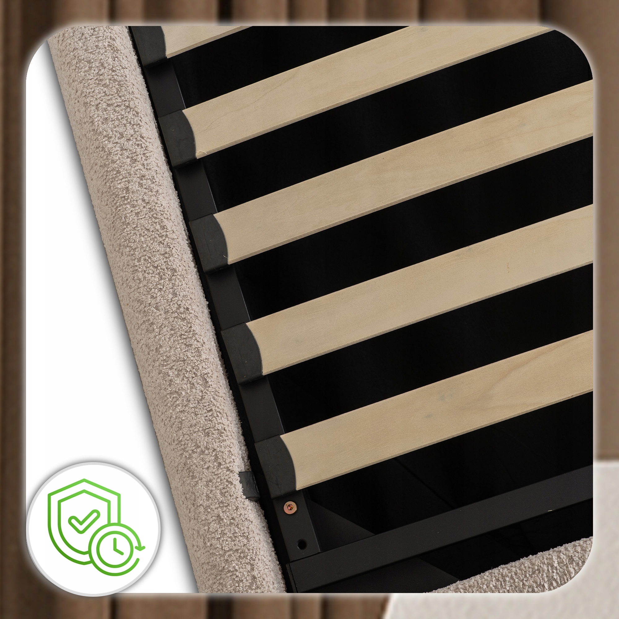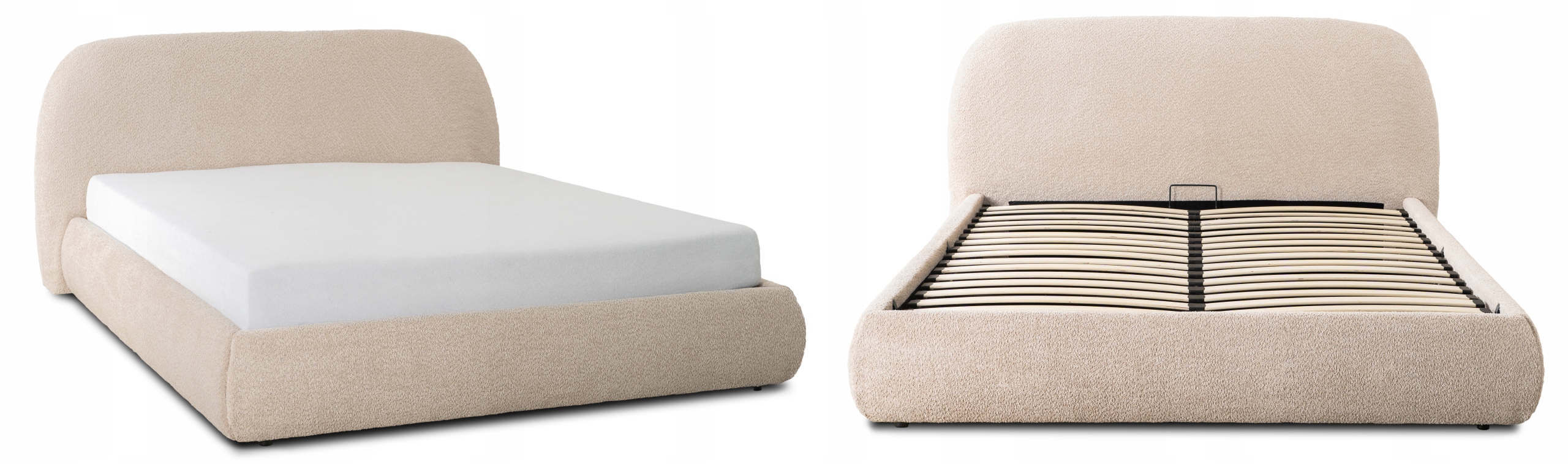 Łóżko zostało obite wyjątkowo przyjemną w dotyku tkaniną teddy, która nie tylko podkreśla elegancki charakter mebla, ale także dodaje mu ciepła i przytulności. Jej miękka faktura sprawia, że codzienny odpoczynek staje się jeszcze bardziej komfortowy, a sypialnia zyskuje stylowy i nowoczesny wygląd.