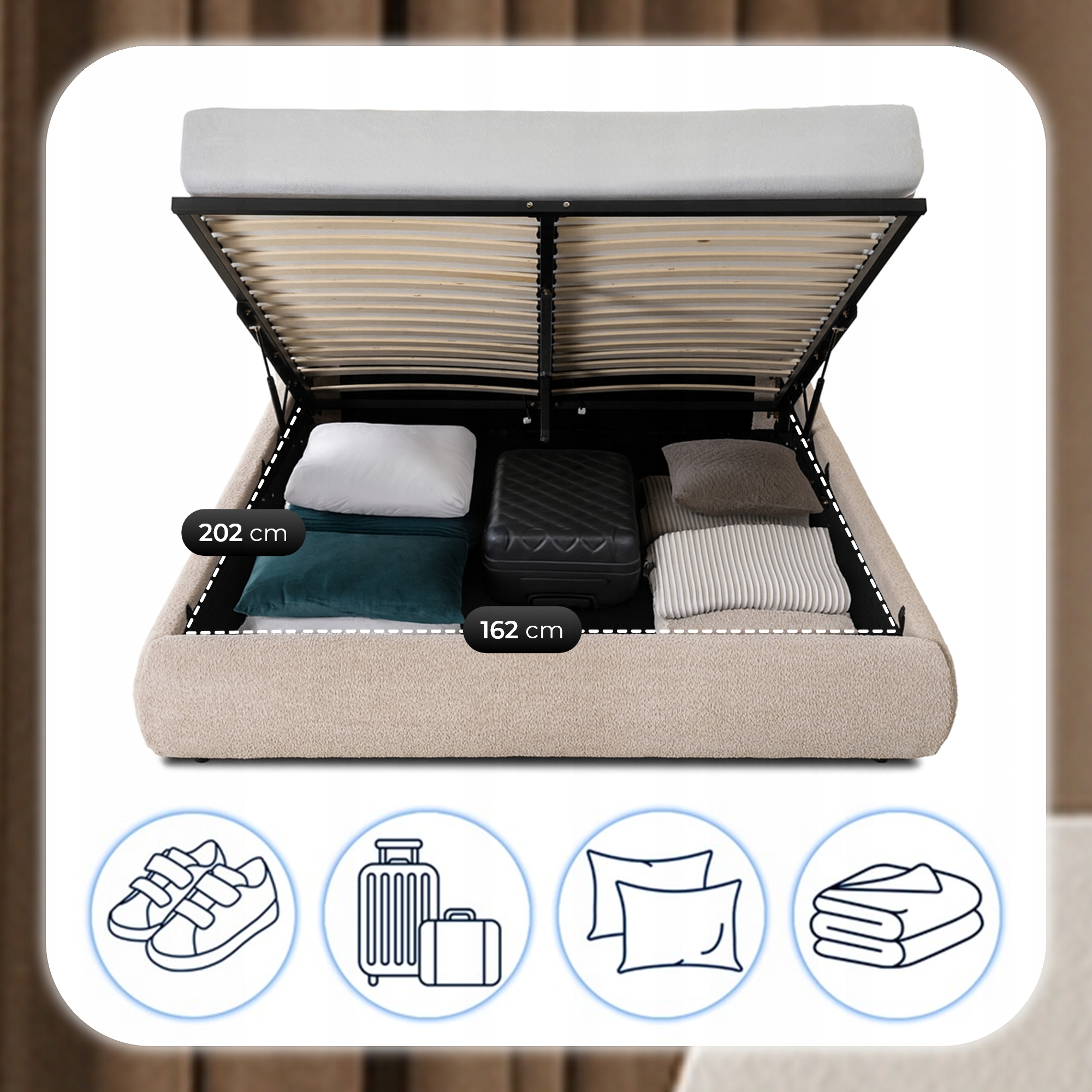 Łóżko kryje w sobie obszerny pojemnik na przechowywanie, który pomieści wszystko, czego potrzebujesz – od kompletów pościeli, przez poduszki i koce, aż po walizki czy sezonowe ubrania. Dzięki wymiarom 202 x 162 cm masz do dyspozycji naprawdę dużą przestrzeń, która pozwoli Ci utrzymać sypialnię w idealnym porządku. To praktyczne rozwiązanie, które sprawdzi się w każdym domu, łącząc funkcjonalność i estetykę.