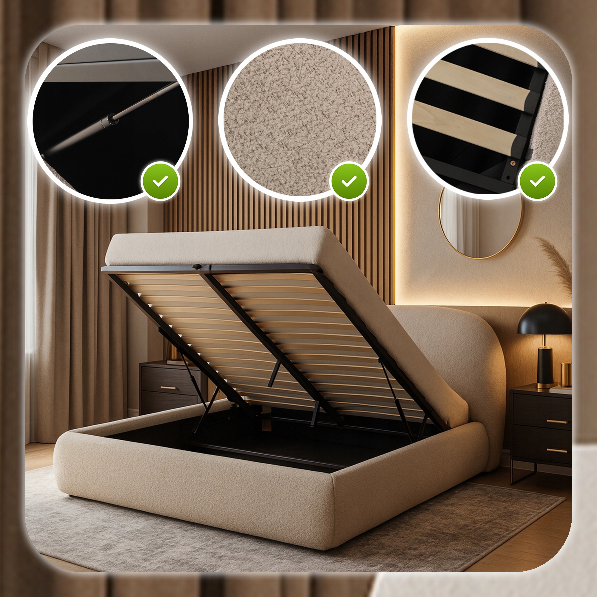 Łóżko wyposażone jest w solidne podnośniki gazowe, które sprawiają, że otwieranie pojemnika staje się bardzo proste – bez wysiłku i w kilka sekund. To rozwiązanie, które łączy funkcjonalność i komfort codziennego użytkowania.