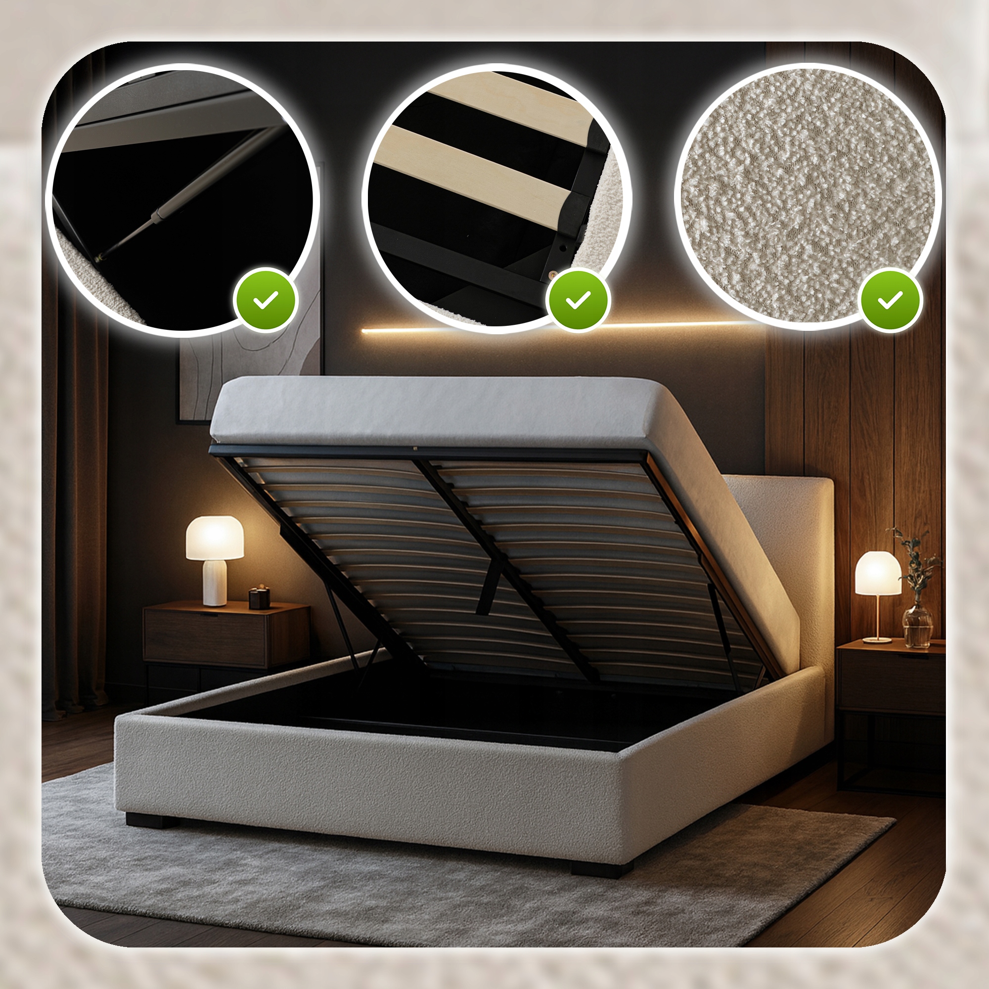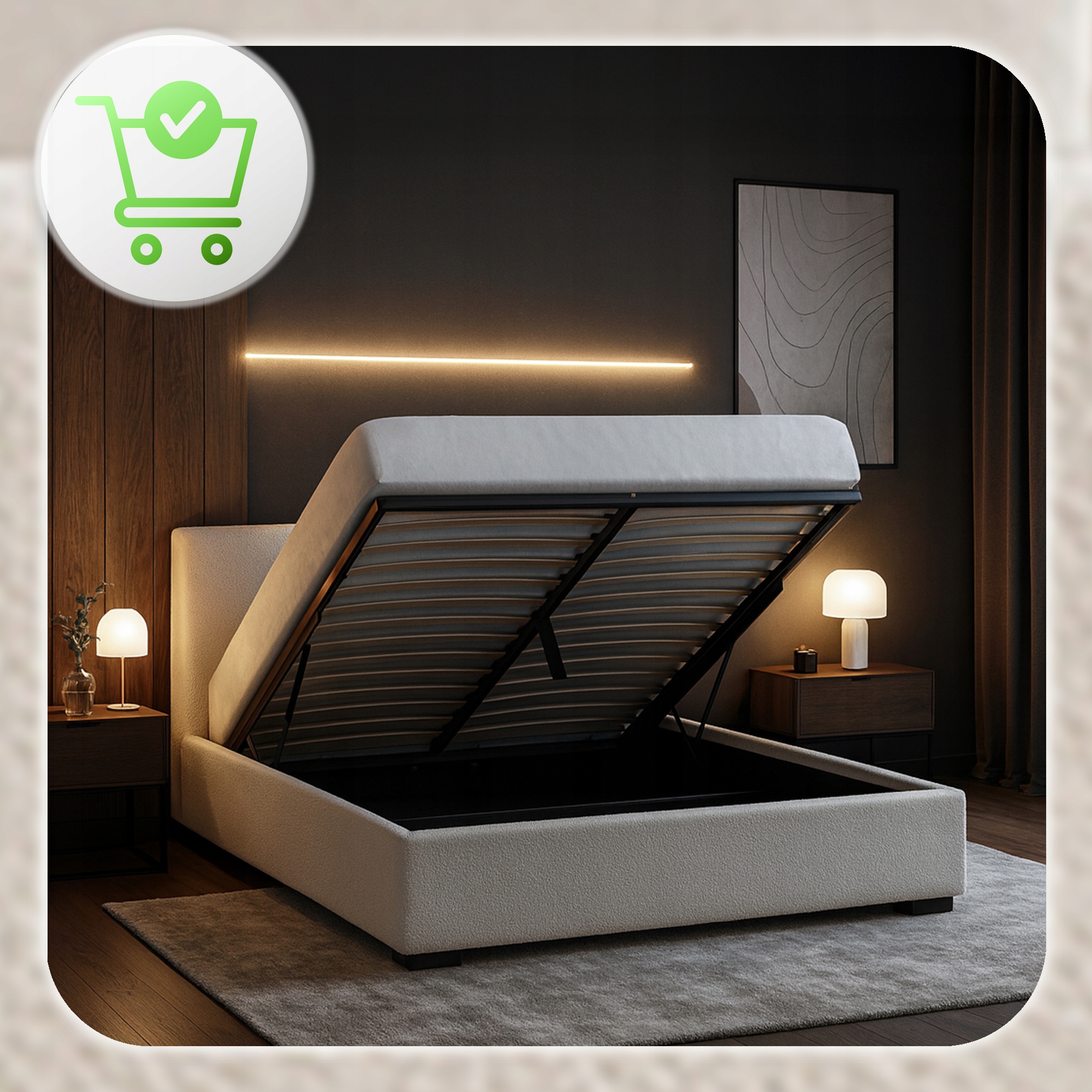 Zachwyca eleganckim kremowym kolorem i miękką barankową tapicerką, która wnosi do wnętrza przytulność i styl. Dzięki praktycznemu pojemnikowi na pościel z solidnymi podnośnikami, łączy w sobie design i funkcjonalność. To gwarancja wygody i nowoczesnego wyglądu w Twojej sypialni.