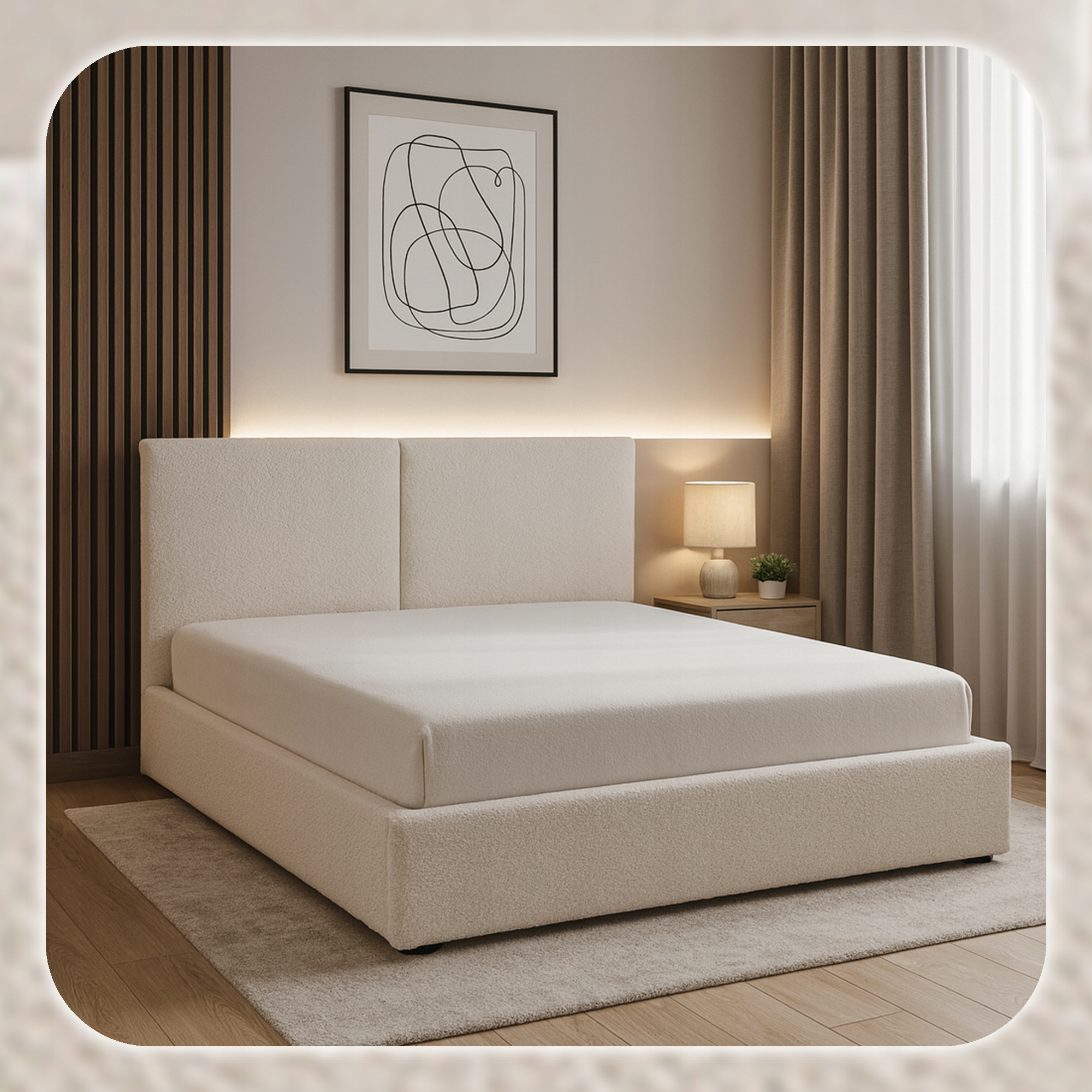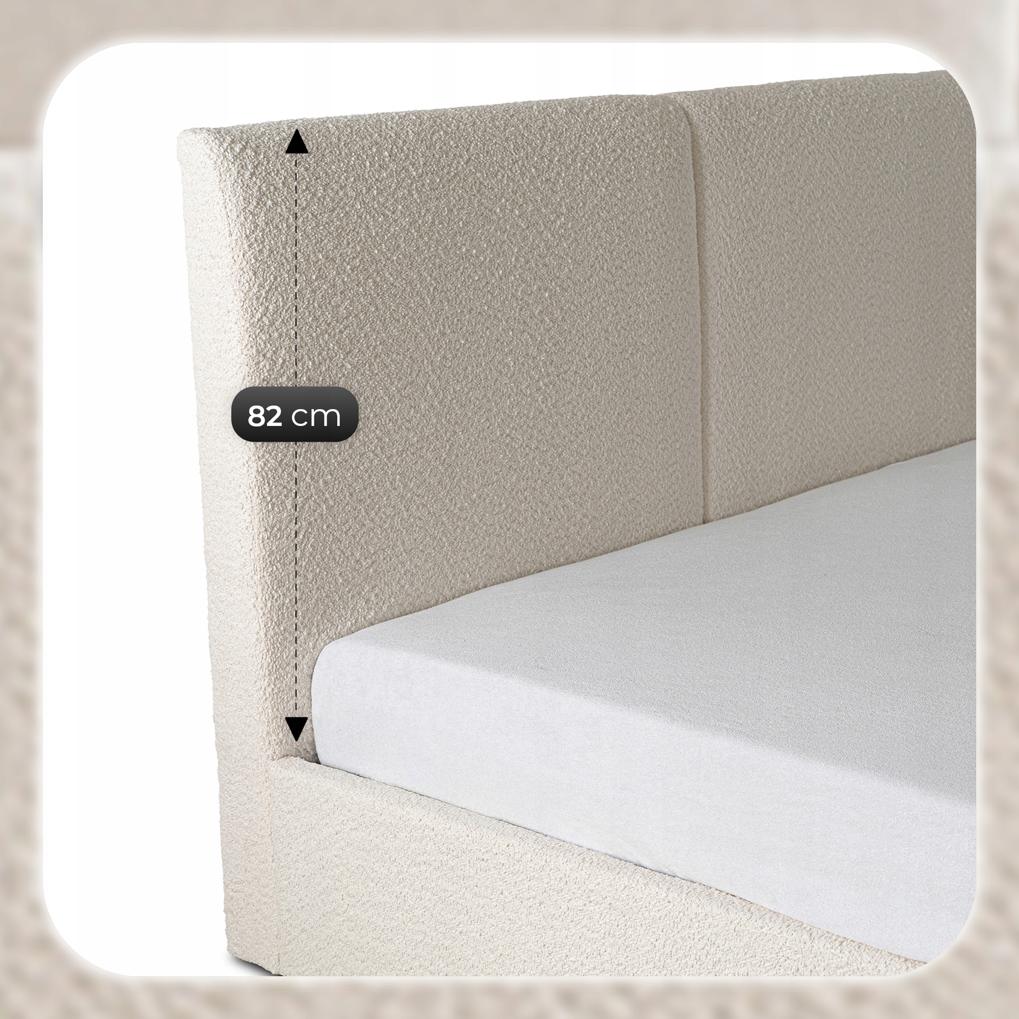 Tapicerowany zagłówek o wysokości 82 cm to gwarancja wygody podczas wieczornego czytania, oglądania telewizji czy relaksu z ulubioną kawą. Jego miękka pikowana konstrukcja i eleganckie wykończenie w kremowej barankowej tkaninie dodają wnętrzu nowoczesnego charakteru, a jednocześnie sprawiają, że łóżko prezentuje się niezwykle stylowo i przytulnie.
