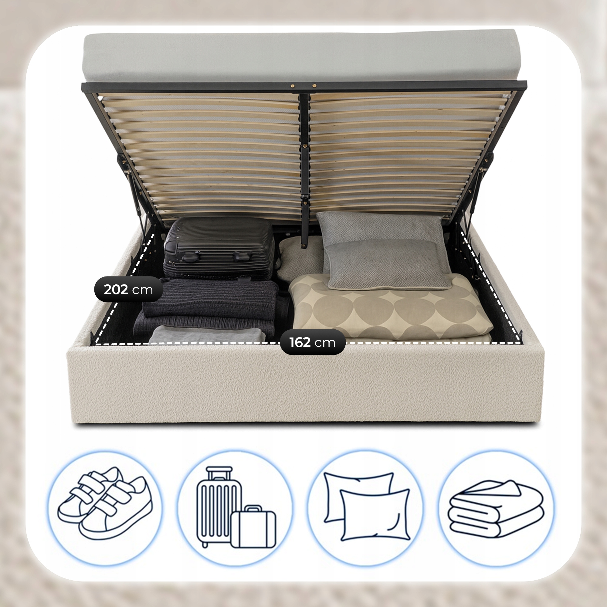 Łóżko kryje w sobie obszerny pojemnik na przechowywanie, który pomieści wszystko, czego potrzebujesz – od kompletów pościeli, przez poduszki i koce, aż po walizki czy sezonowe ubrania. Dzięki wymiarom 202 x 162 cm masz do dyspozycji naprawdę dużą przestrzeń, która pozwoli Ci utrzymać sypialnię w idealnym porządku. To praktyczne rozwiązanie, które sprawdzi się w każdym domu, łącząc funkcjonalność i estetykę.