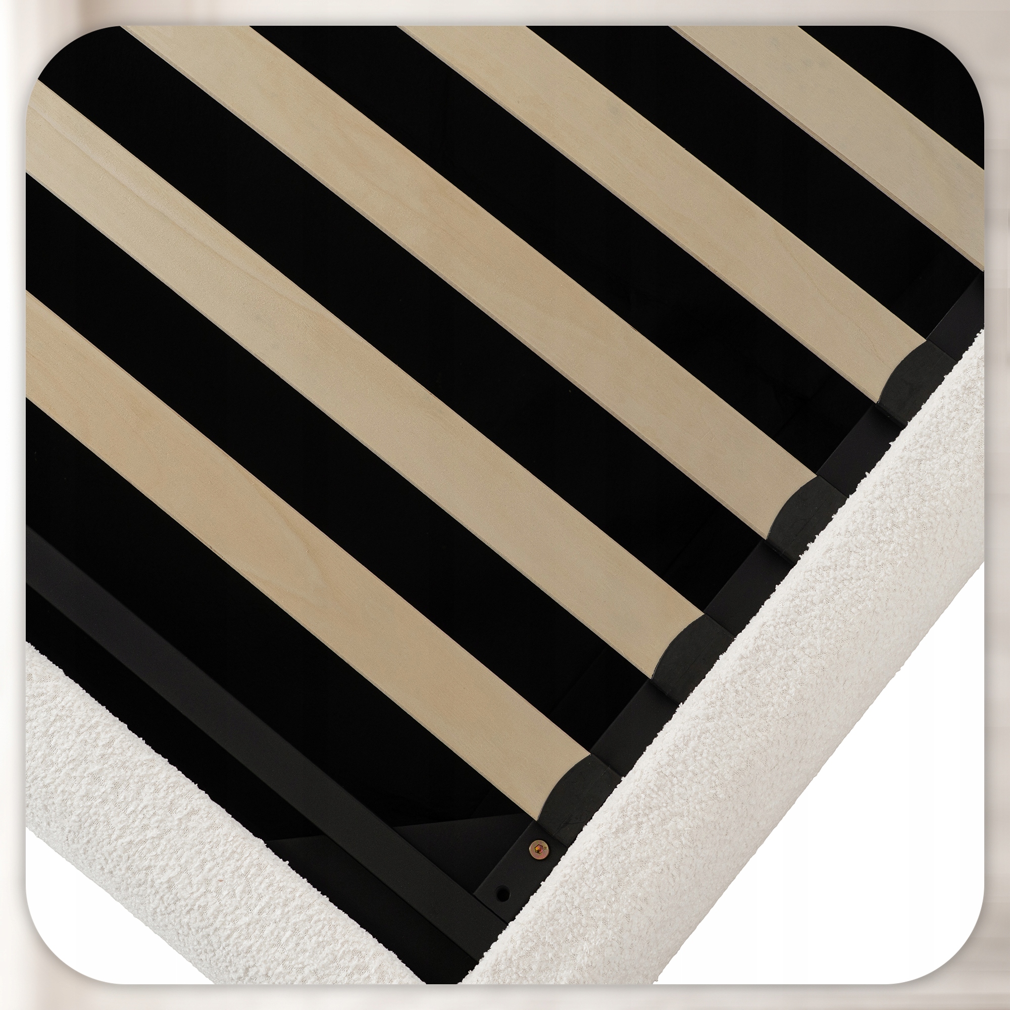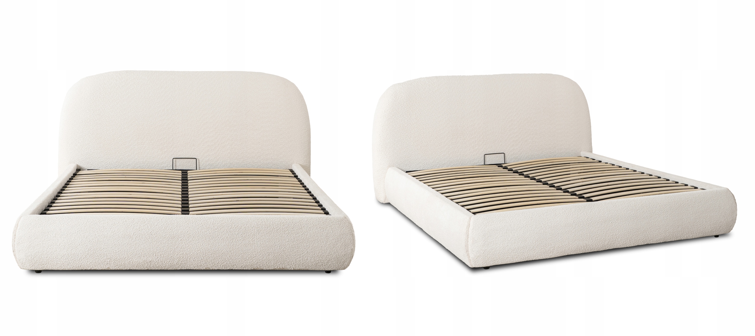 Łóżko zostało obite wyjątkowo przyjemną w dotyku tkaniną teddy, która nie tylko podkreśla elegancki charakter mebla, ale także dodaje mu ciepła i przytulności. Jej miękka faktura sprawia, że codzienny odpoczynek staje się jeszcze bardziej komfortowy, a sypialnia zyskuje stylowy i nowoczesny wygląd.