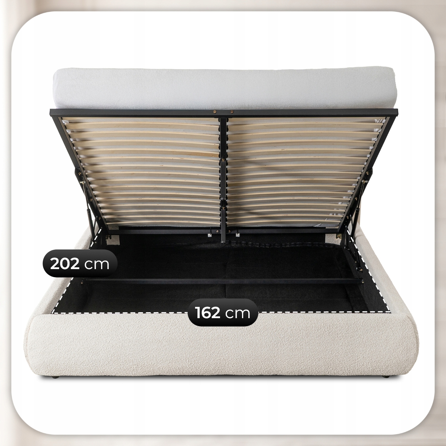 Łóżko kryje w sobie obszerny pojemnik na przechowywanie, który pomieści wszystko, czego potrzebujesz – od kompletów pościeli, przez poduszki i koce, aż po walizki czy sezonowe ubrania. Dzięki wymiarom 202 x 162 cm masz do dyspozycji naprawdę dużą przestrzeń, która pozwoli Ci utrzymać sypialnię w idealnym porządku. To praktyczne rozwiązanie, które sprawdzi się w każdym domu, łącząc funkcjonalność i estetykę.