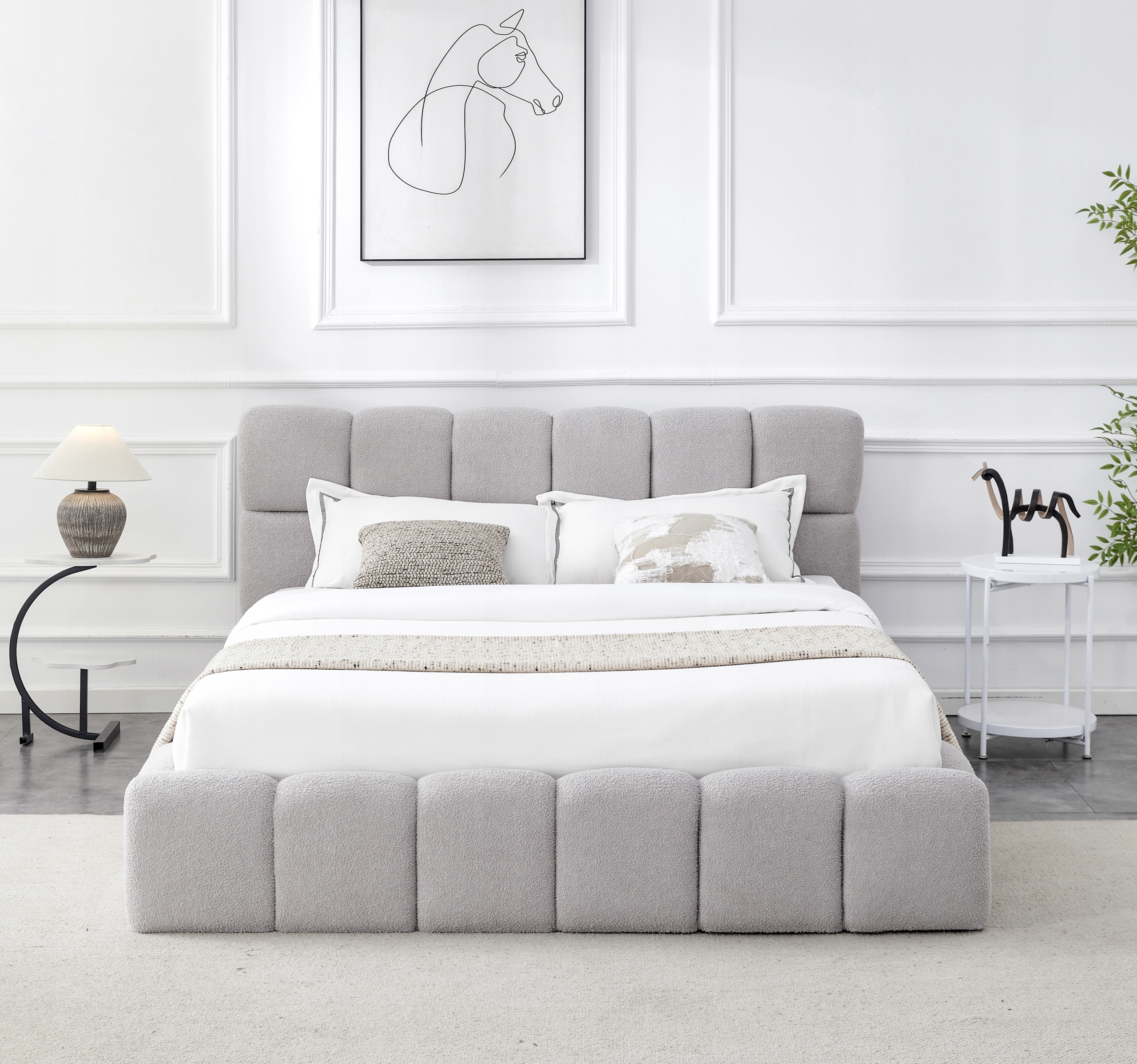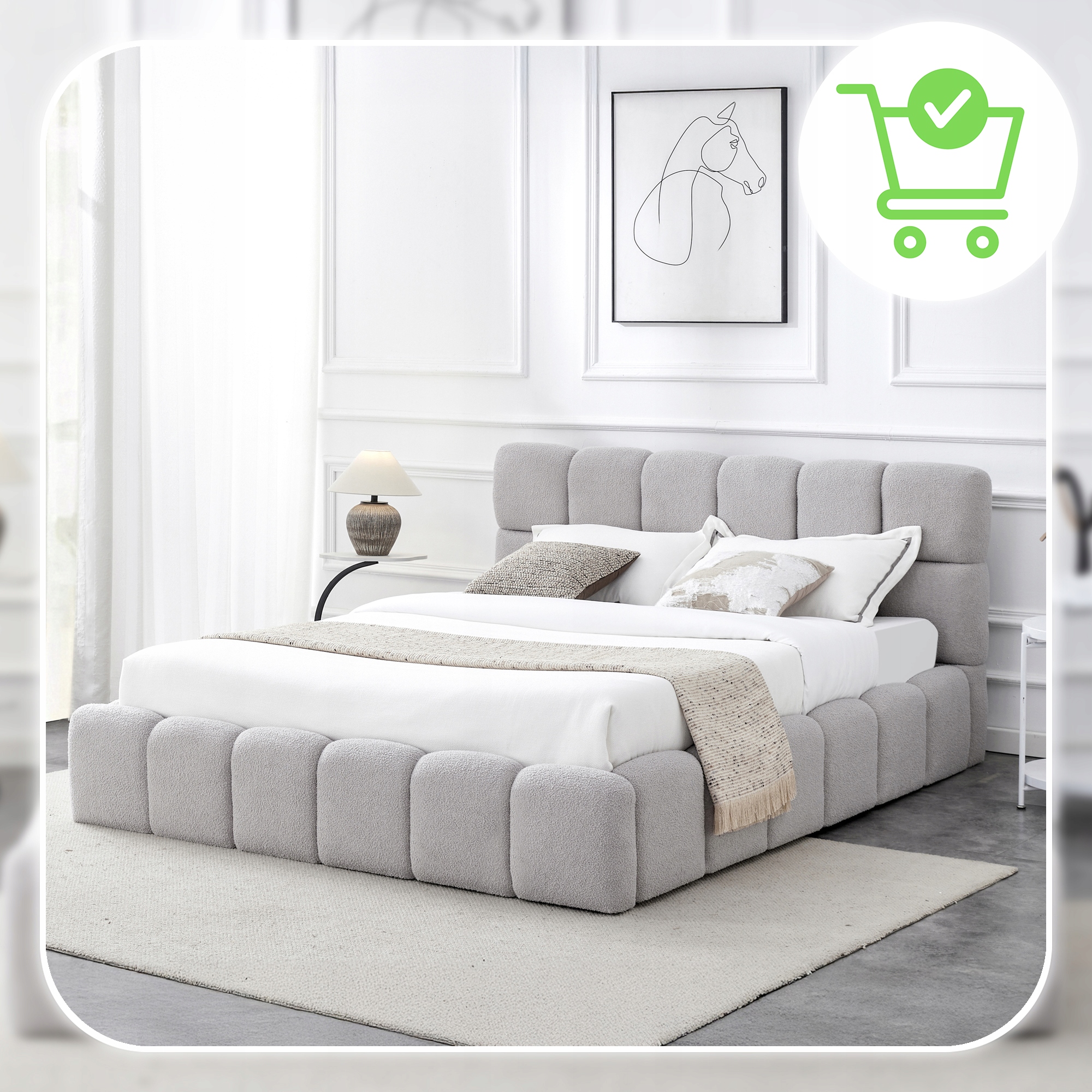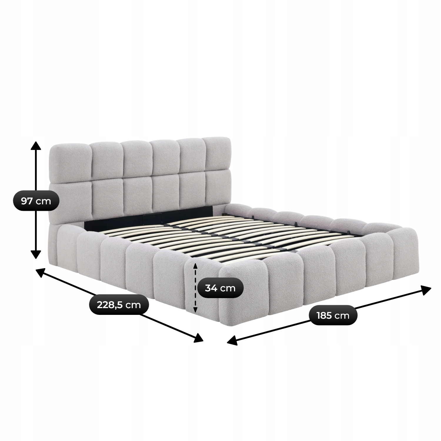 Łóżko zostało obite wyjątkowo przyjemną w dotyku tkaniną teddy, która nie tylko podkreśla elegancki charakter mebla, ale także dodaje mu ciepła i przytulności. Jej barankowa, miękka faktura sprawia, że codzienny odpoczynek staje się jeszcze bardziej komfortowy, a sypialnia zyskuje stylowy i nowoczesny wygląd.