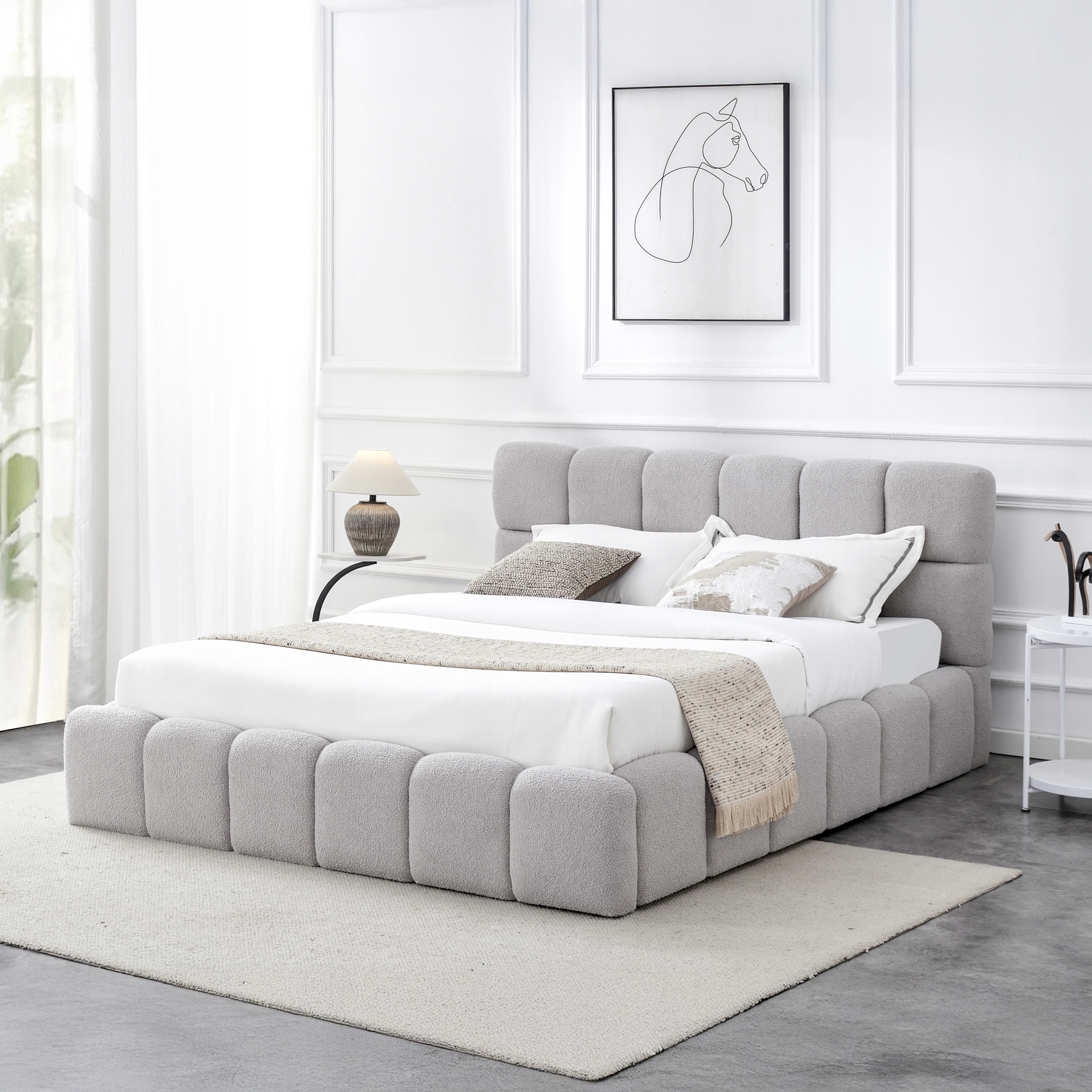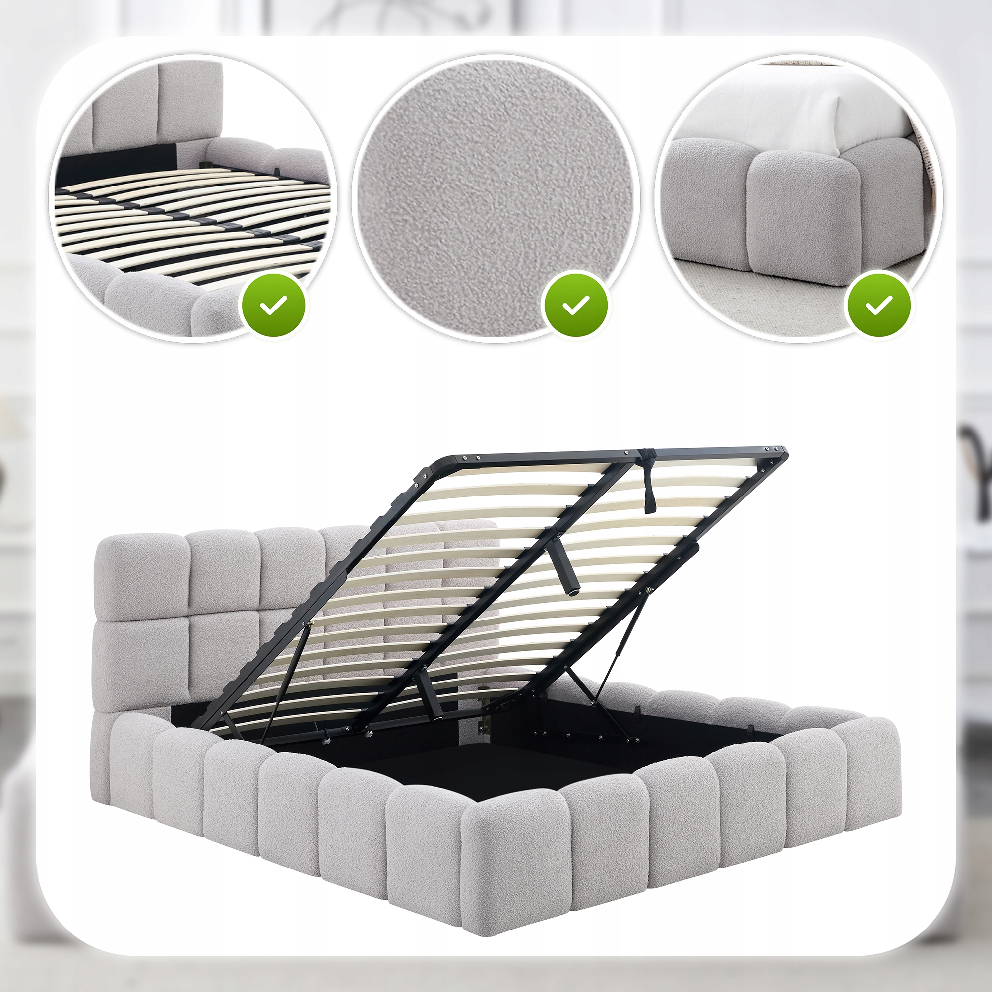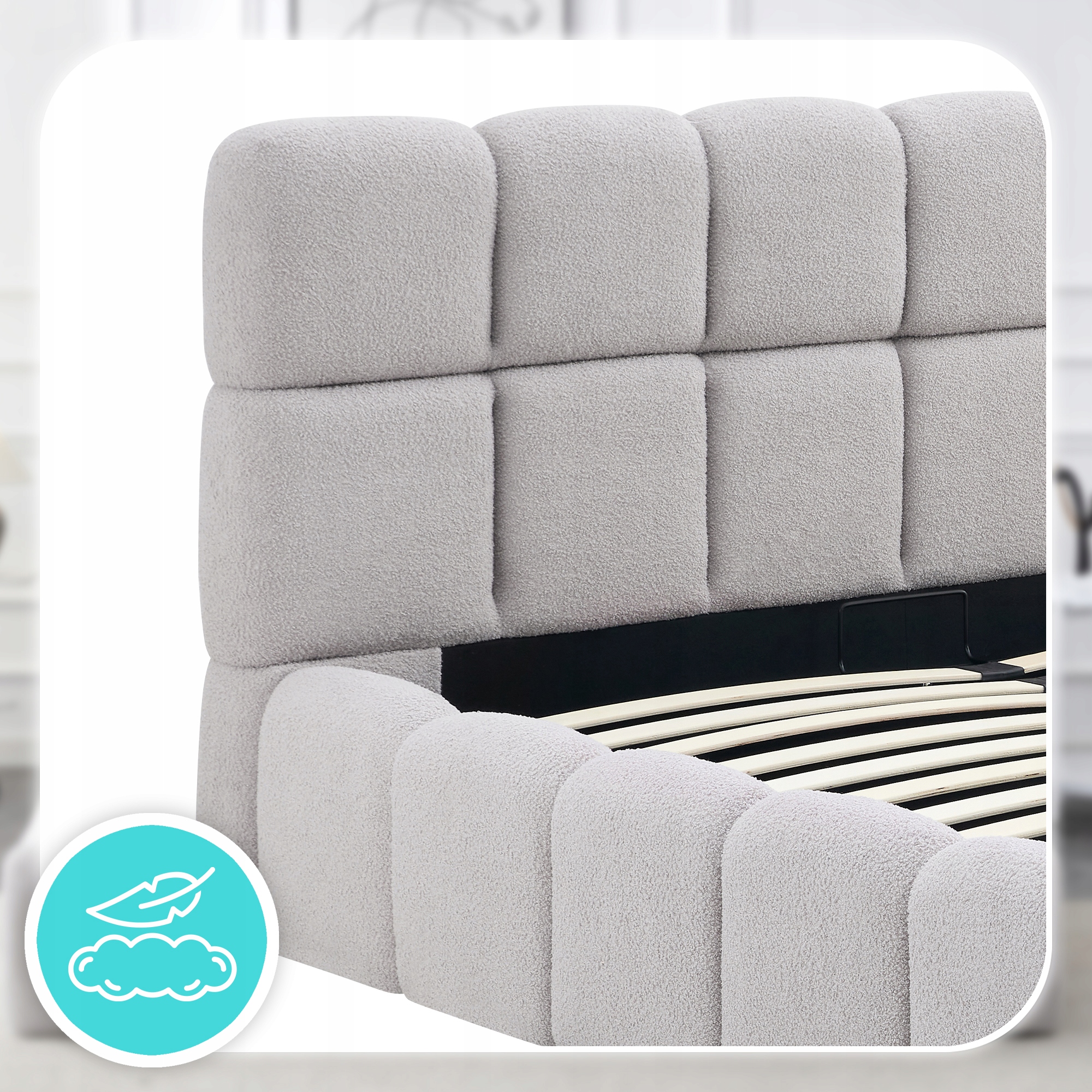Łóżko zostało obite wyjątkowo przyjemną w dotyku tkaniną teddy, która nie tylko podkreśla elegancki charakter mebla, ale także dodaje mu ciepła i przytulności. Jej barankowa, miękka faktura sprawia, że codzienny odpoczynek staje się jeszcze bardziej komfortowy, a sypialnia zyskuje stylowy i nowoczesny wygląd.