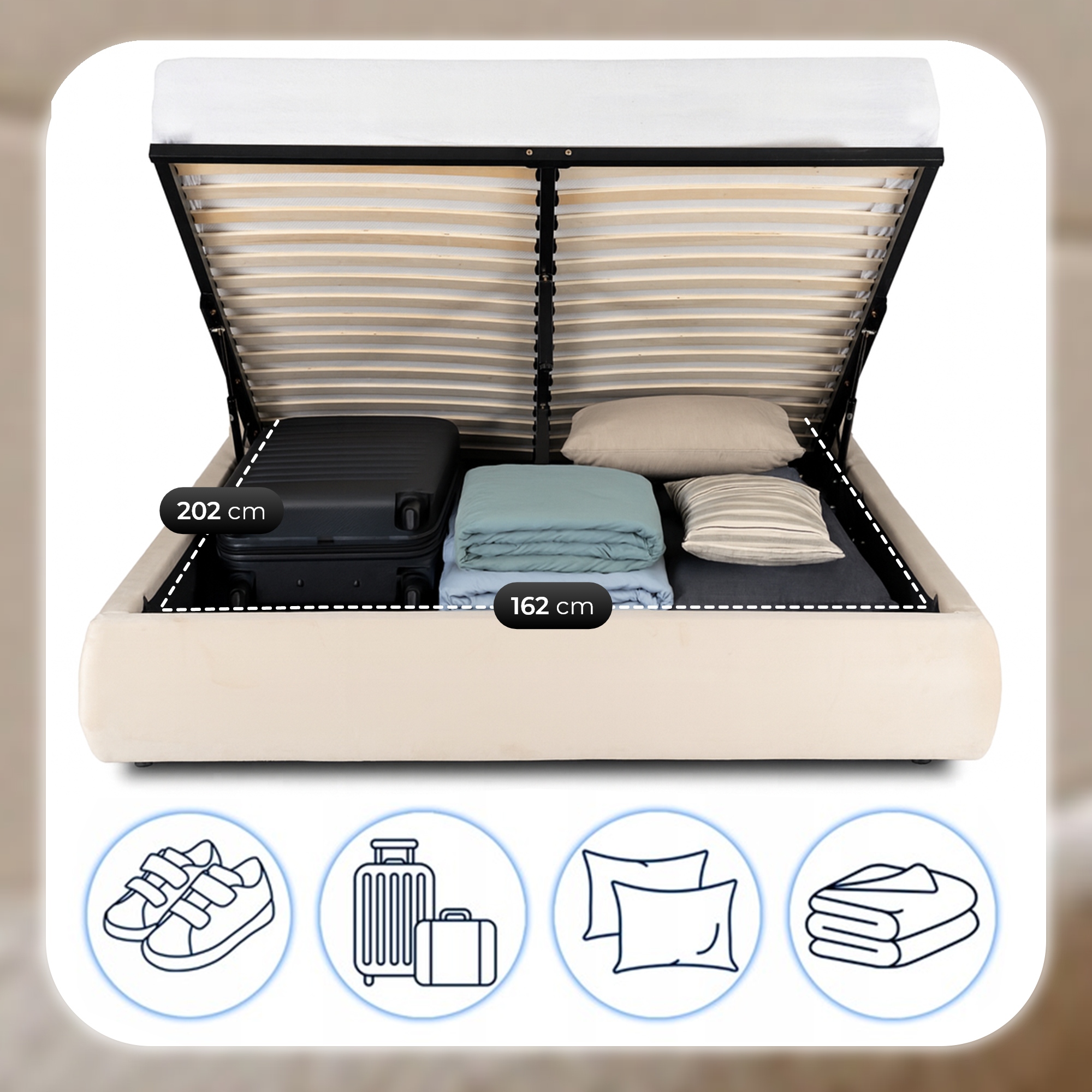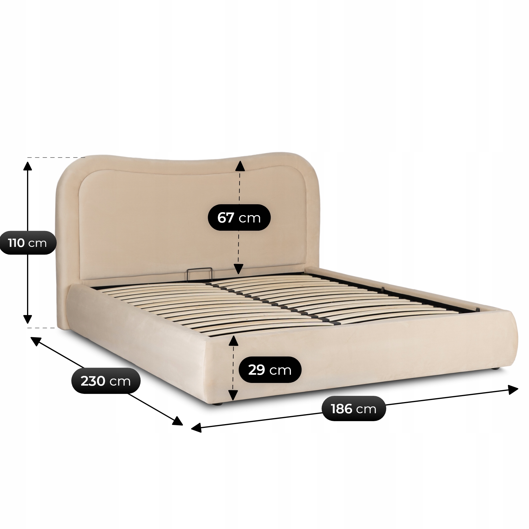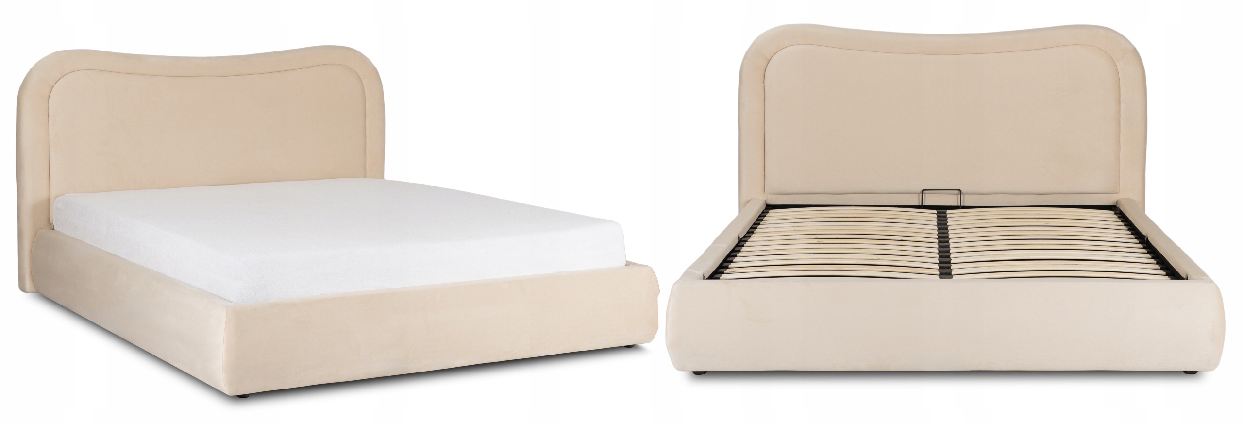 Zachwyca kremowym kolorem i miękką welurową tapicerką, która wprowadza do wnętrza elegancję i przytulność. Zaokrąglony zagłówek o subtelnej linii dodaje lekkości, a pojemny schowek na pościel z solidnymi podnośnikami łączy styl z funkcjonalnością. To idealne łóżko dla tych, którzy cenią komfort, design i nowoczesny charakter sypialni.
