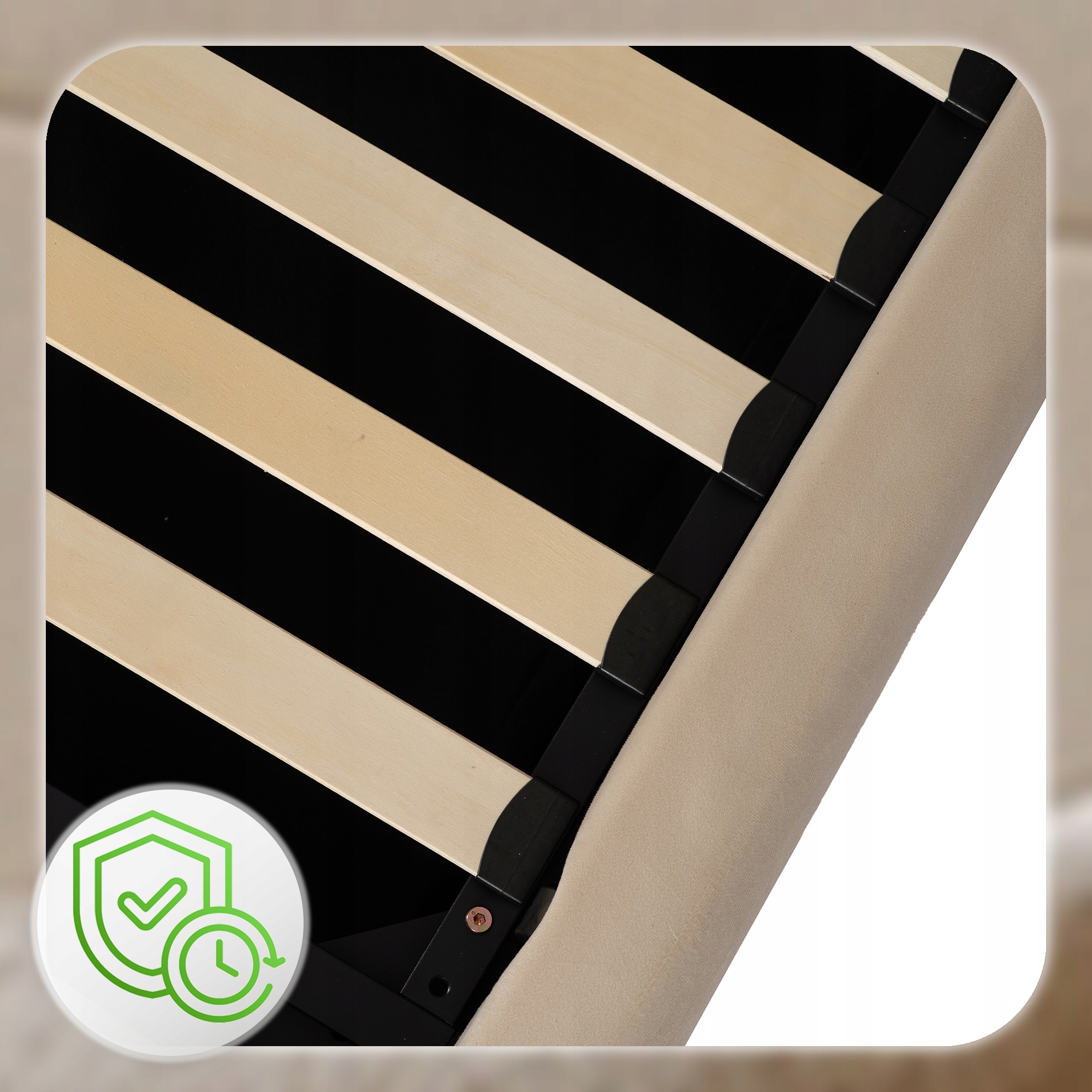 Łóżko zostało wyposażone w solidny stelaż z elastycznych listew, które gwarantują nie tylko stabilność, ale także odpowiednie podparcie dla materaca. Dzięki swojej wytrzymałości szczebelki zapewniają komfortowy i zdrowy sen przez długie lata, sprawiając, że łóżko posłuży Ci niezawodnie każdego dnia.