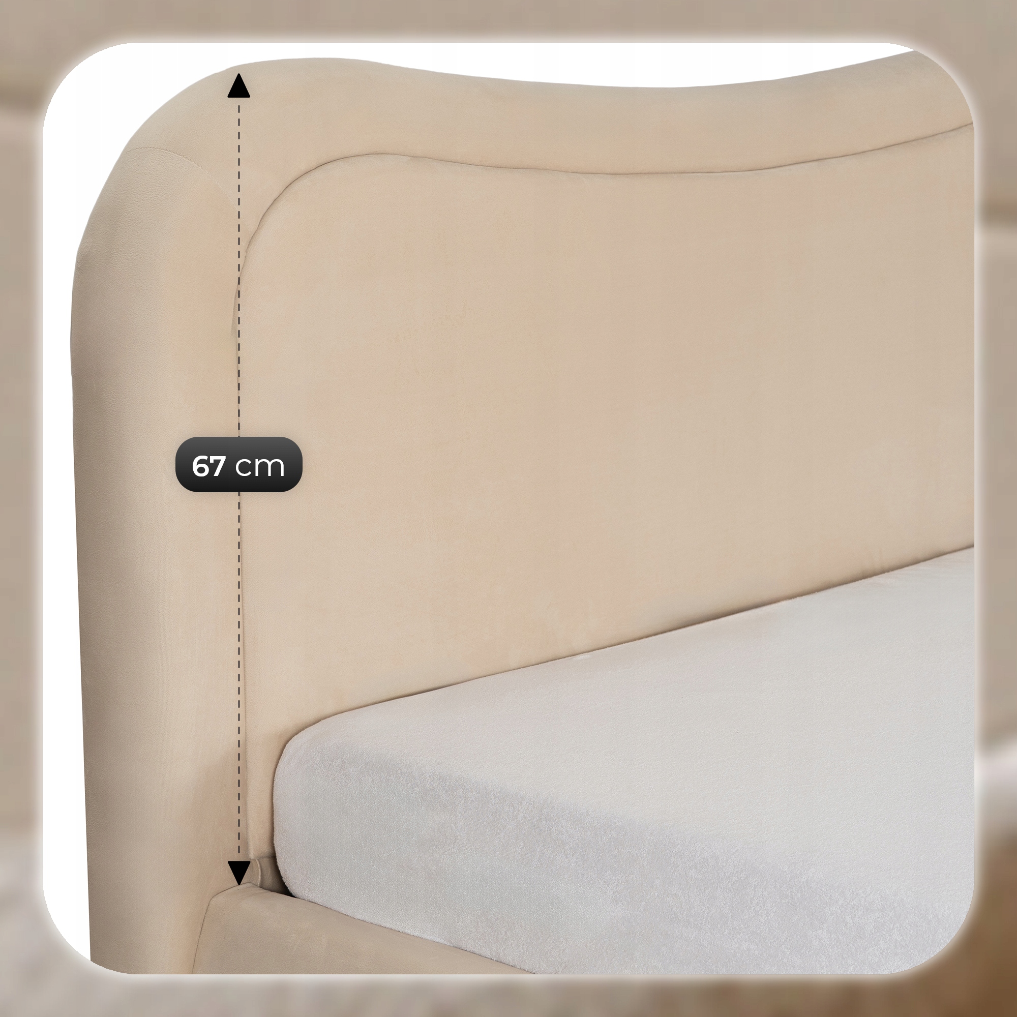 Tapicerowany zagłówek o wysokości 67 cm to gwarancja wygody podczas wieczornego czytania, oglądania telewizji czy relaksu z ulubioną kawą. Jego zaokrąglony kształt i eleganckie wykończenie w kremowej tkaninie dodają wnętrzu nowoczesnego charakteru, a jednocześnie sprawiają, że łóżko prezentuje się niezwykle stylowo i przytulnie.