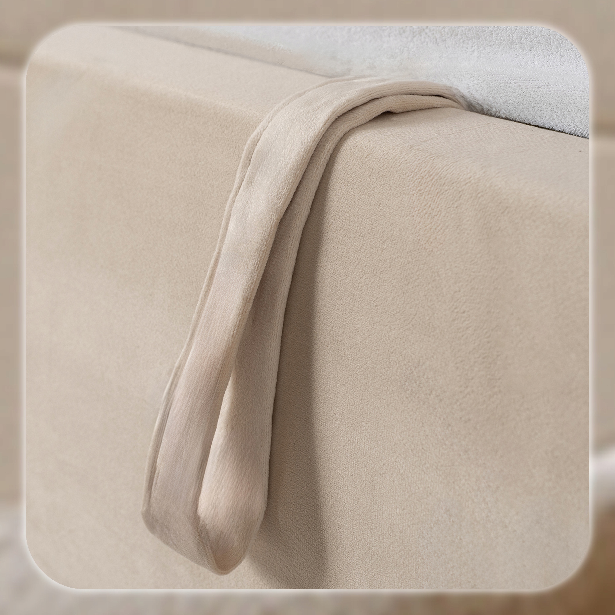- Miękka welurowa tapicerka w kremowym kolorze – elegancka, przyjemna w dotyku i nadająca wnętrzu wyjątkowej przytulności.
