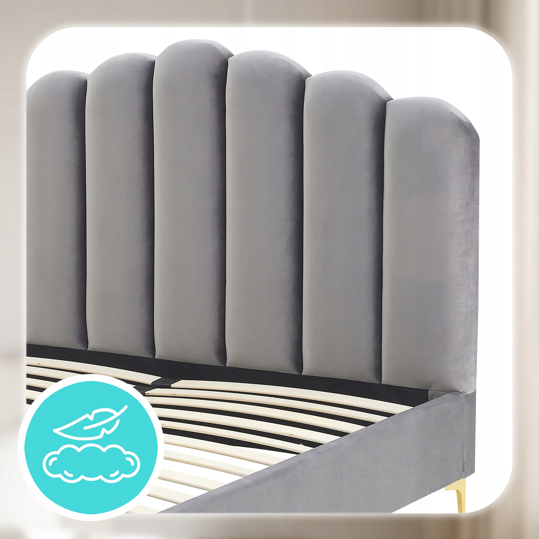 - Miękka welurowa tapicerka w szarym kolorze – elegancka, przyjemna w dotyku i nadająca wnętrzu wyjątkowej przytulności.