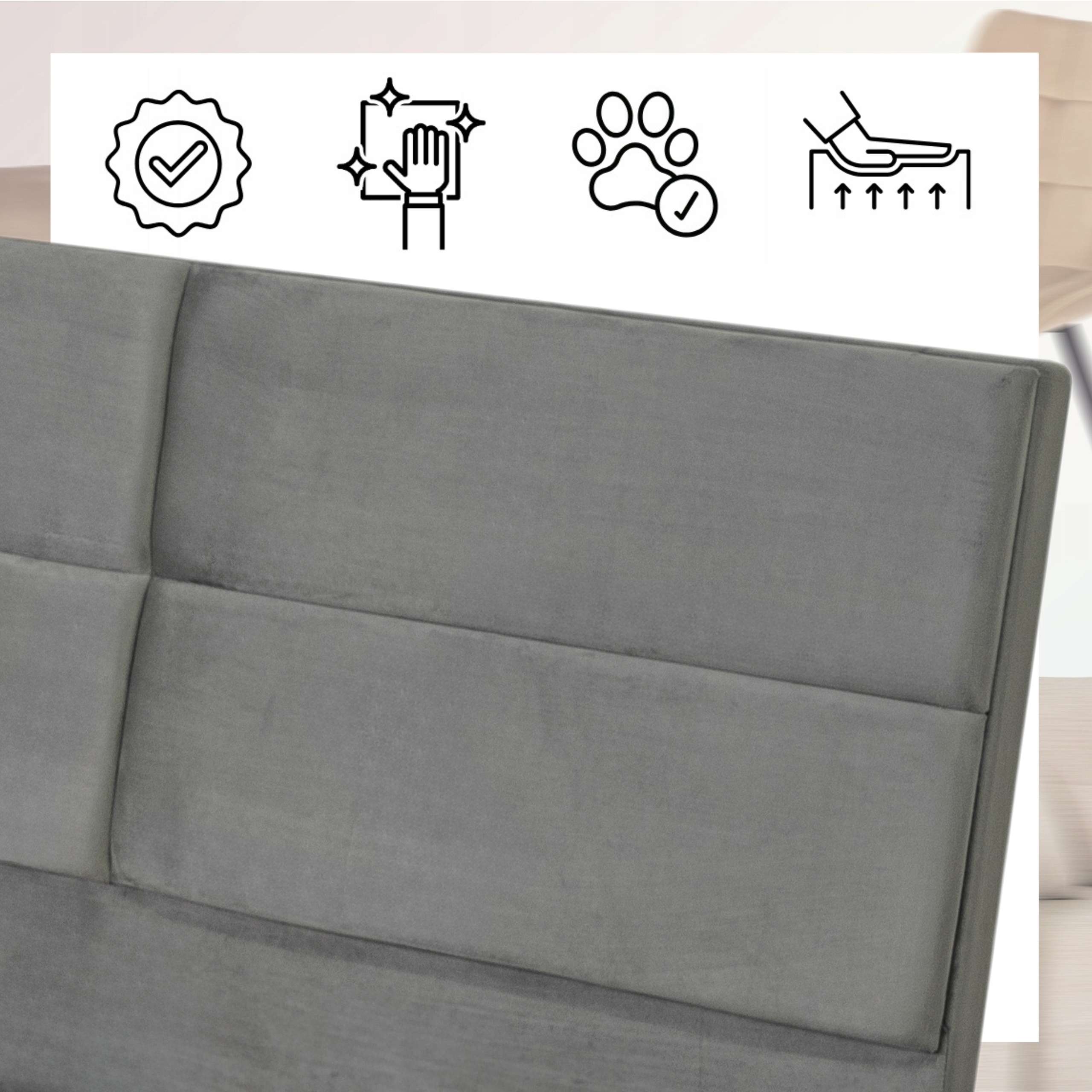 Obicie wykonano z wysokiej jakości tkaniny typu velvet, odpornej na ścieranie i zabrudzenia. Jest przyjemna w dotyku, a jednocześnie łatwa w czyszczeniu, co czyni ją doskonałym wyborem dla rodzin z dziećmi oraz właścicieli zwierząt domowych.