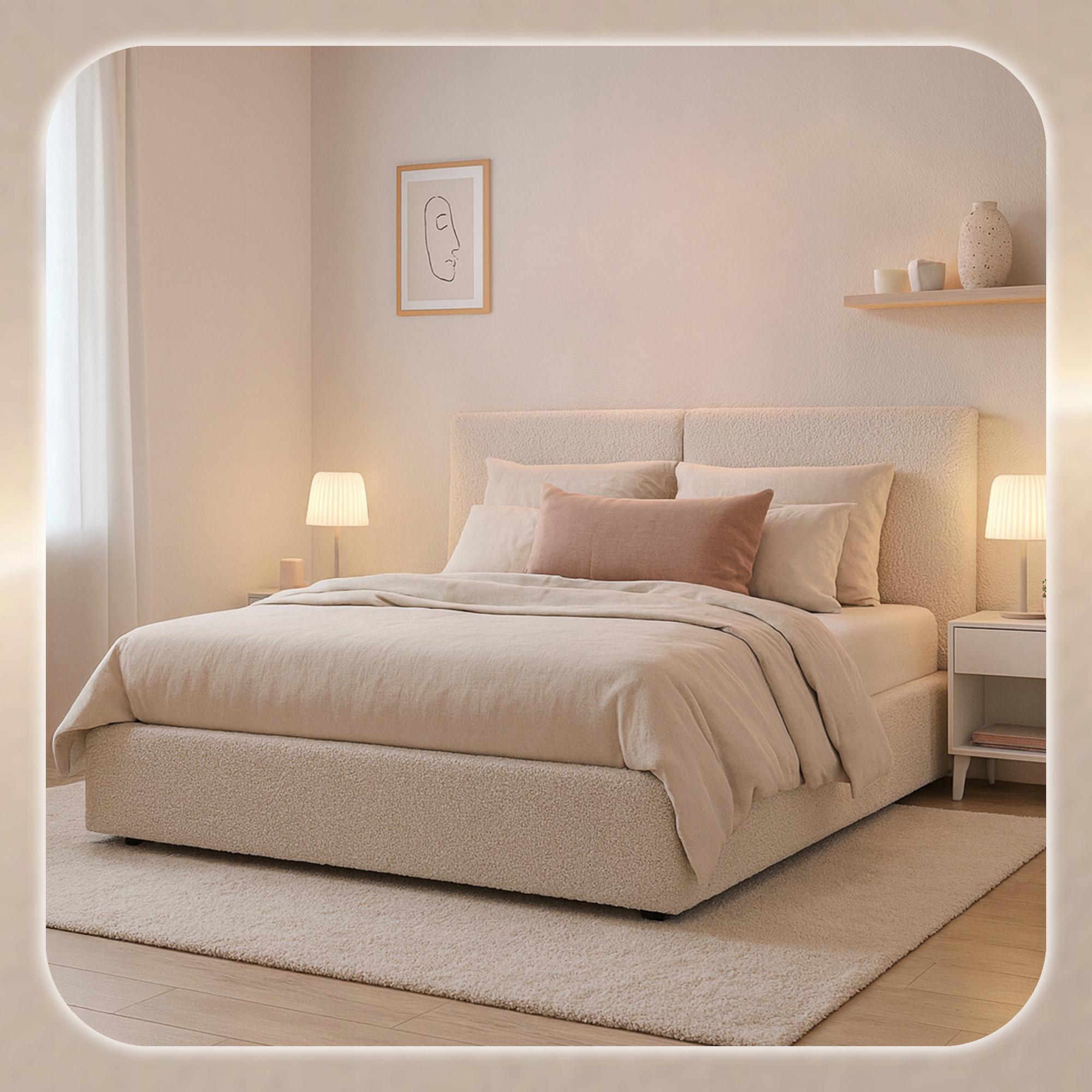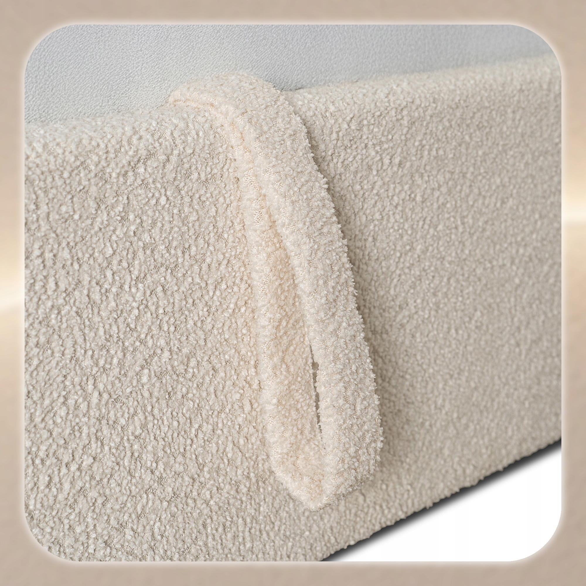 - Miękka tapicerka typu teddy w kremowym kolorze – elegancka, przyjemna w dotyku i nadająca wnętrzu wyjątkowej przytulności.