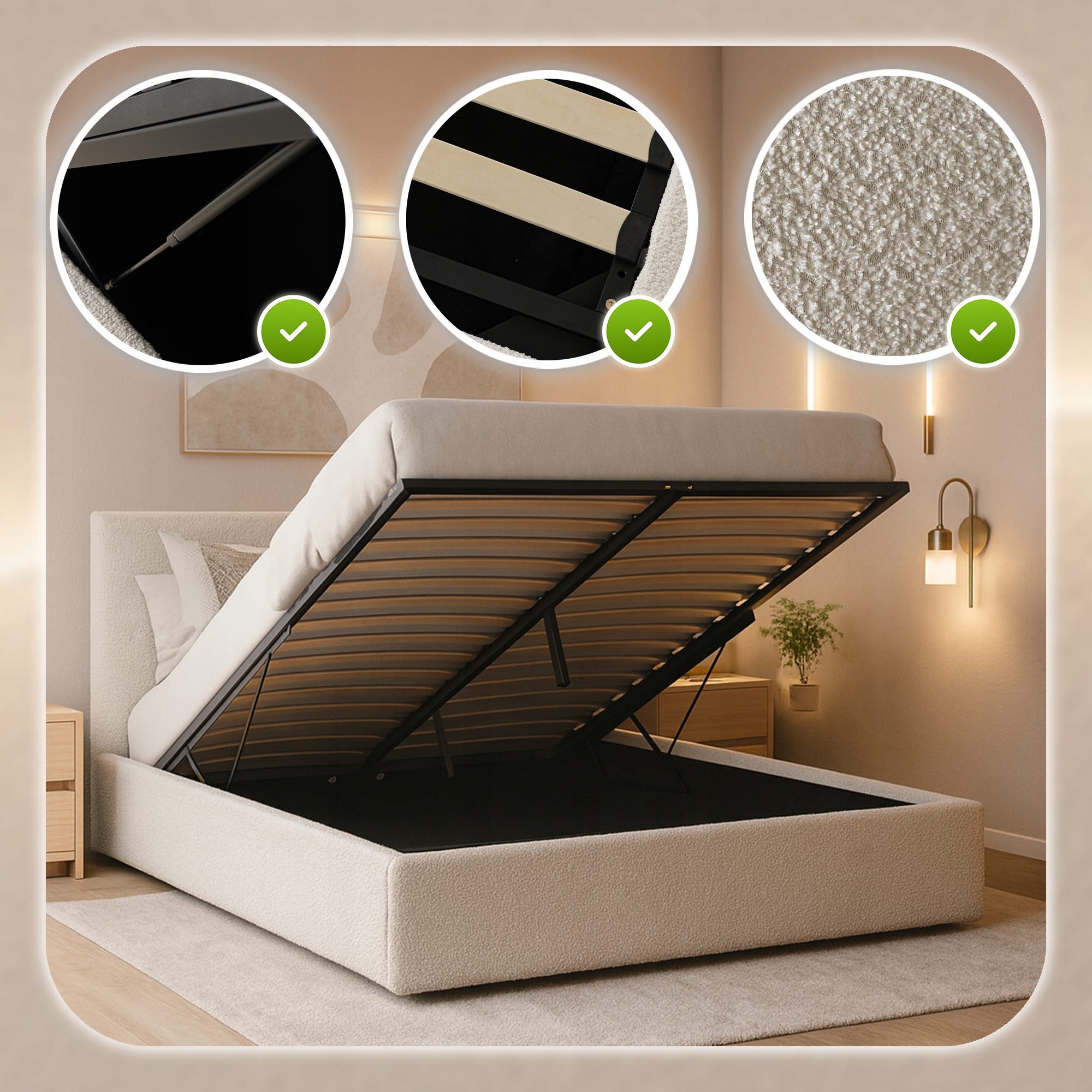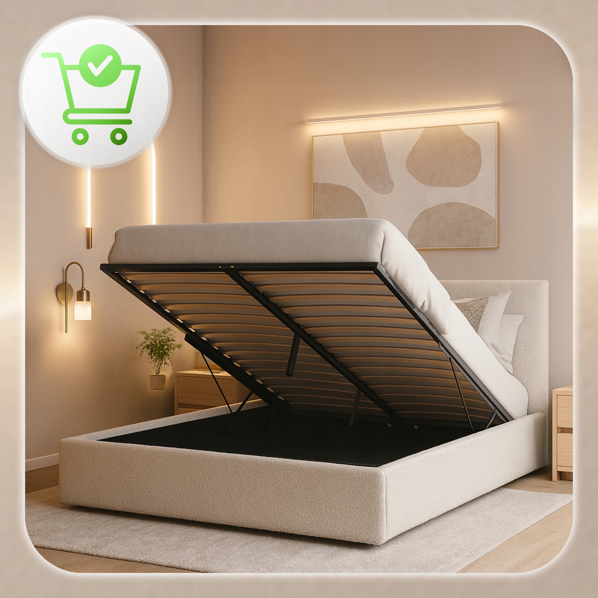 Łóżko wyposażone jest w solidne podnośniki gazowe, które sprawiają, że otwieranie pojemnika staje się bardzo proste – bez wysiłku i w kilka sekund. To rozwiązanie, które łączy funkcjonalność i komfort codziennego użytkowania.