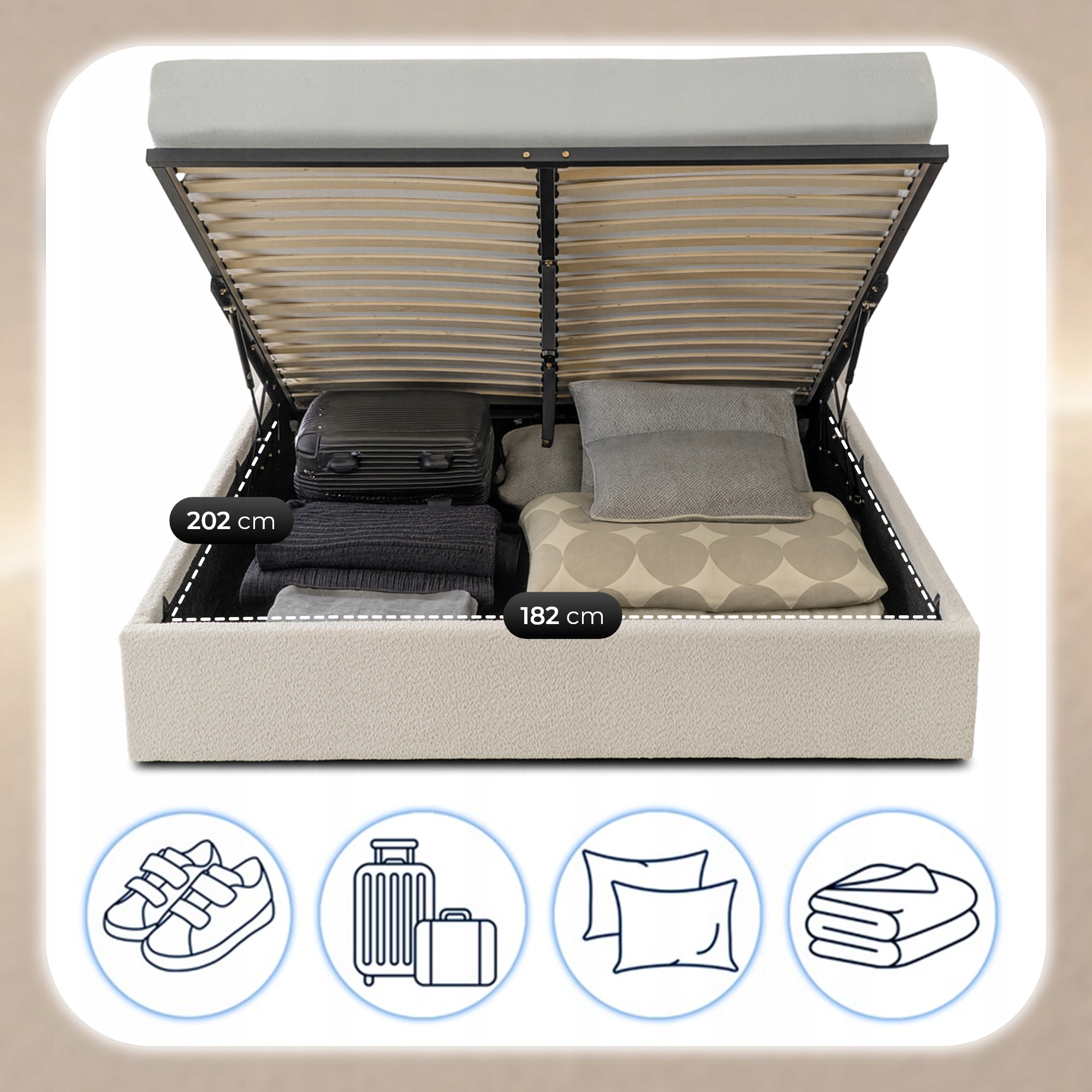 Łóżko kryje w sobie obszerny pojemnik na przechowywanie, który pomieści wszystko, czego potrzebujesz – od kompletów pościeli, przez poduszki i koce, aż po walizki czy sezonowe ubrania. Dzięki wymiarom 202 x 162 cm masz do dyspozycji naprawdę dużą przestrzeń, która pozwoli Ci utrzymać sypialnię w idealnym porządku. To praktyczne rozwiązanie, które sprawdzi się w każdym domu, łącząc funkcjonalność i estetykę.