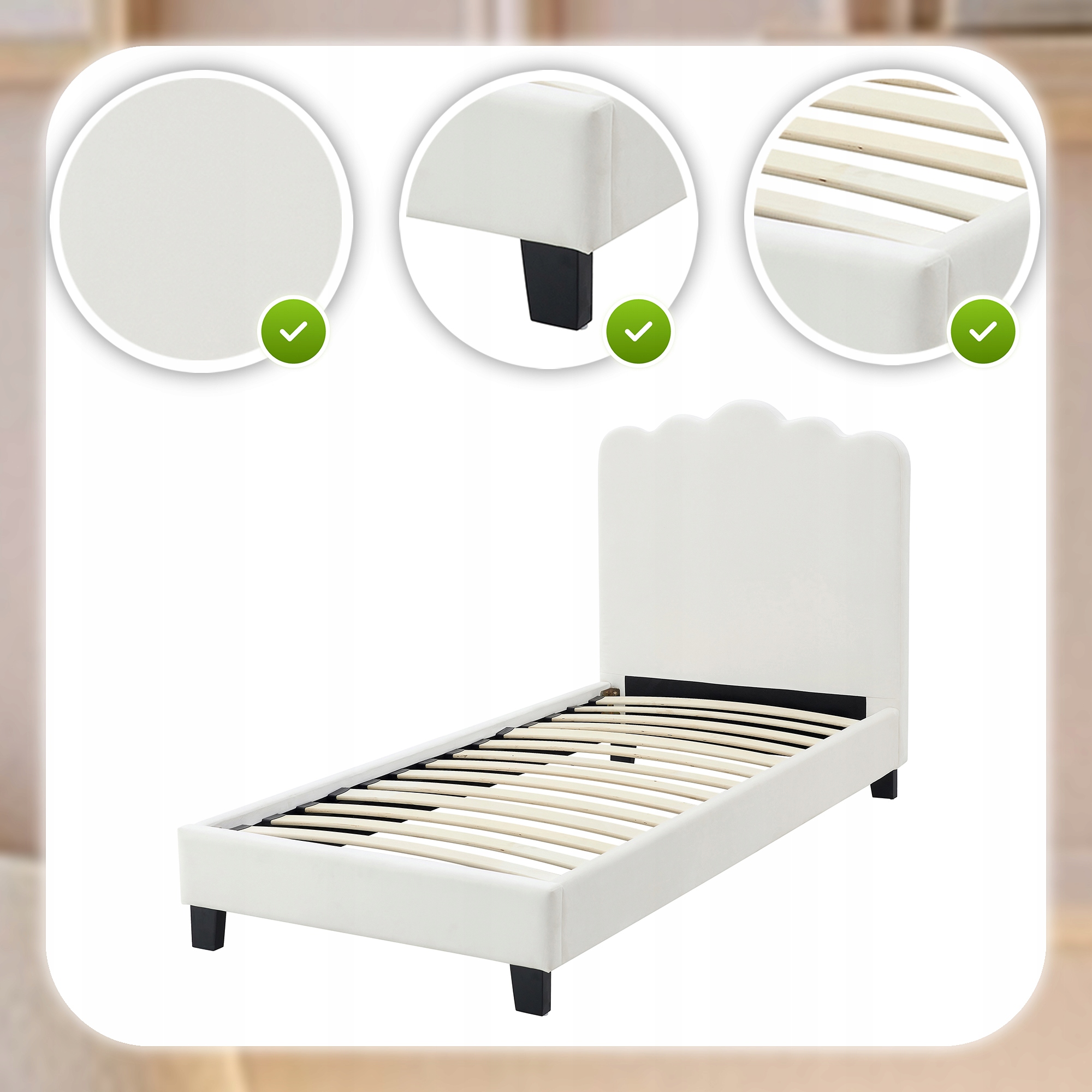 ✨ Łóżko 90x200 Tapicerowane Jednoosobowe Do Sypialni Welurowe Krem CRATER