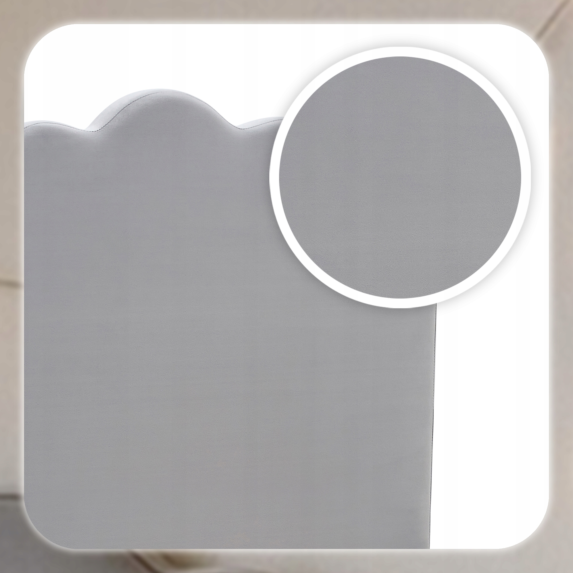 - Miękka welurowa tapicerka w szarym kolorze – elegancka, przyjemna w dotyku i nadająca wnętrzu wyjątkowej przytulności.