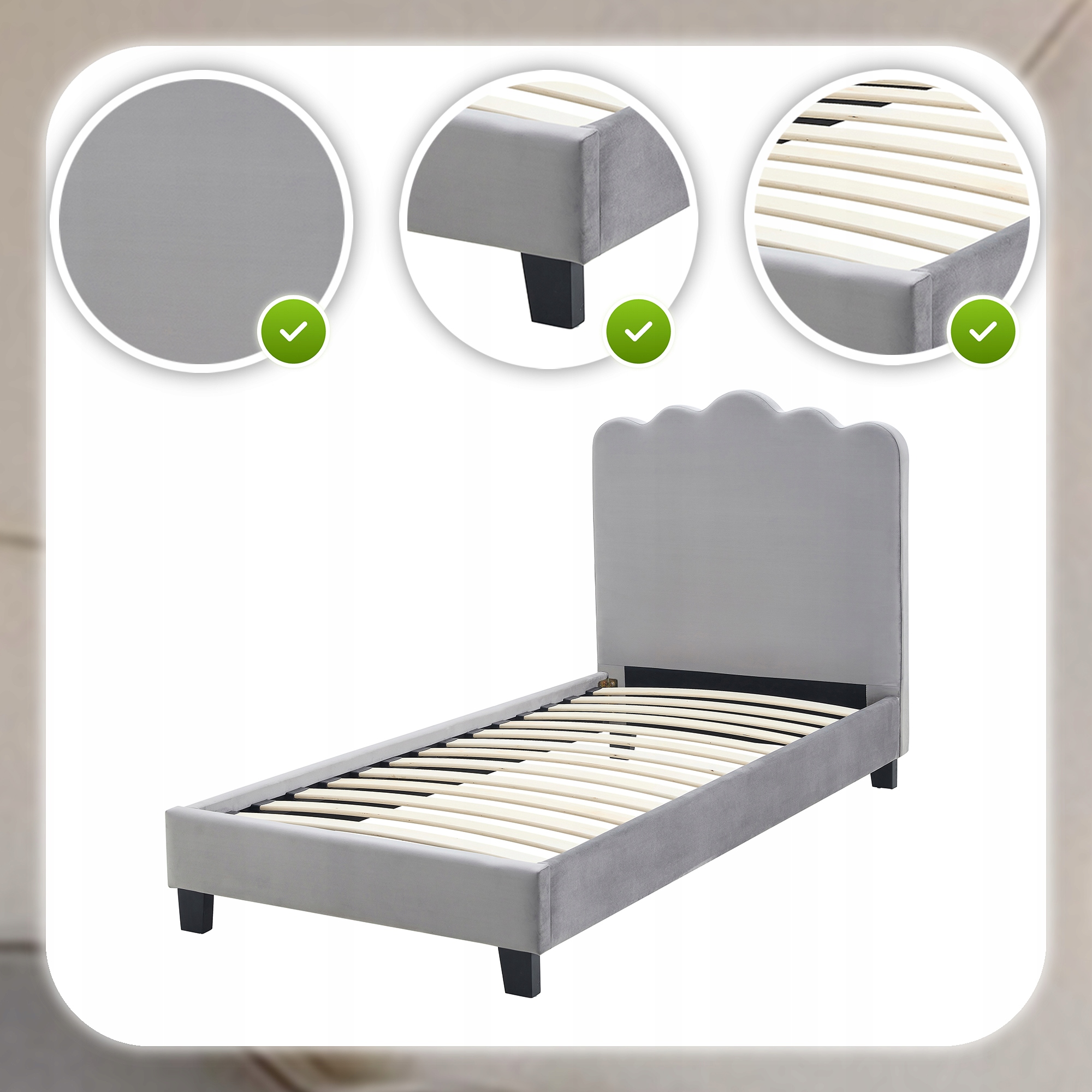 ✨ Łóżko 90x200 Tapicerowane Jednoosobowe Do Sypialni Welurowe Szary CRATER