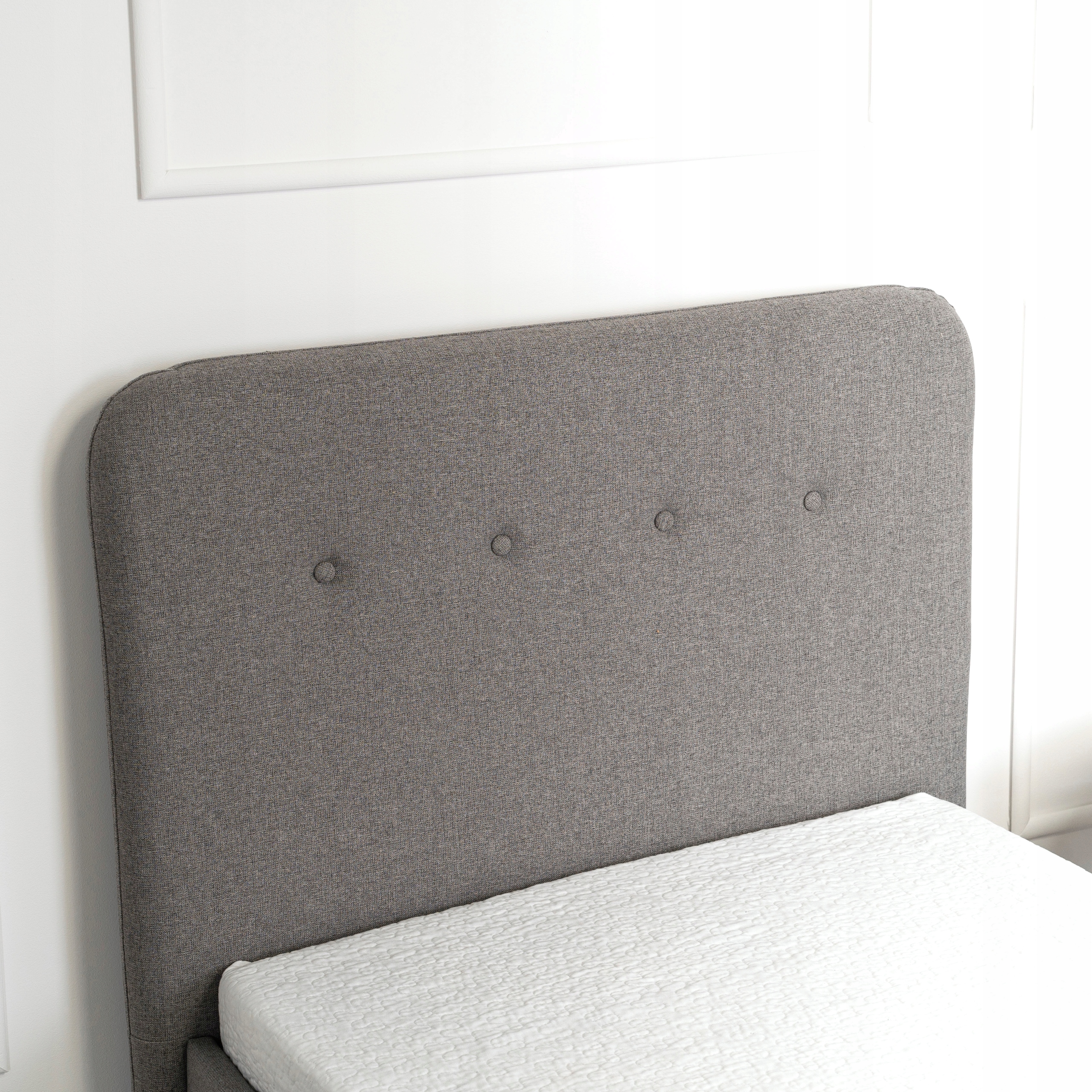 Wygodne i bezpieczne, bo miękka tapicerka pokrywa wszystkie krawędzie łóżka. No i do tego naprawdę eleganckie. Z dekoracyjnym pikowaniem za pomocą guzików także pokrytych tkaniną, które zdobią wezgłowie łóżka.
