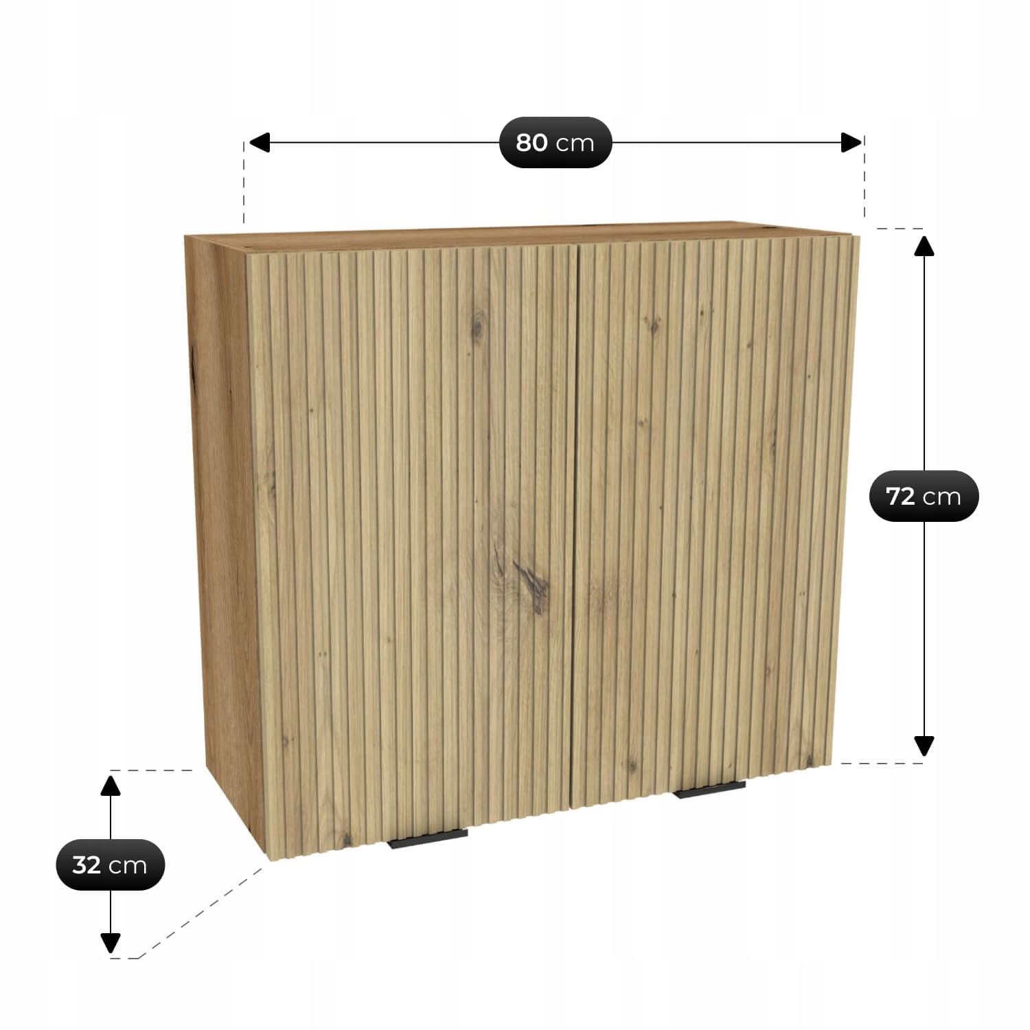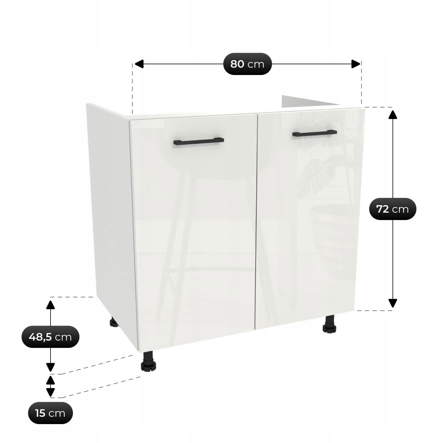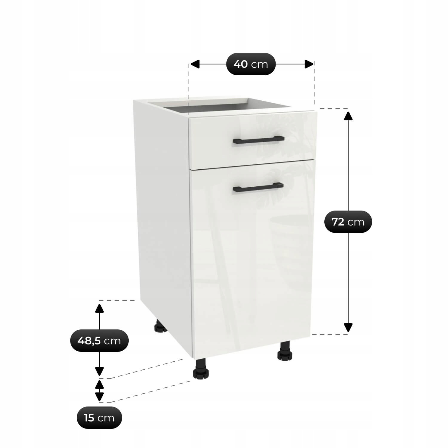Fronty wykonane są z płyty MDF pokrytej folią na wysoki połysk, co zapewnia trwałość oraz nowoczesny wygląd. Korpusy to solidna płyta laminowana odporna na wilgoć i codzienne użytkowanie.
