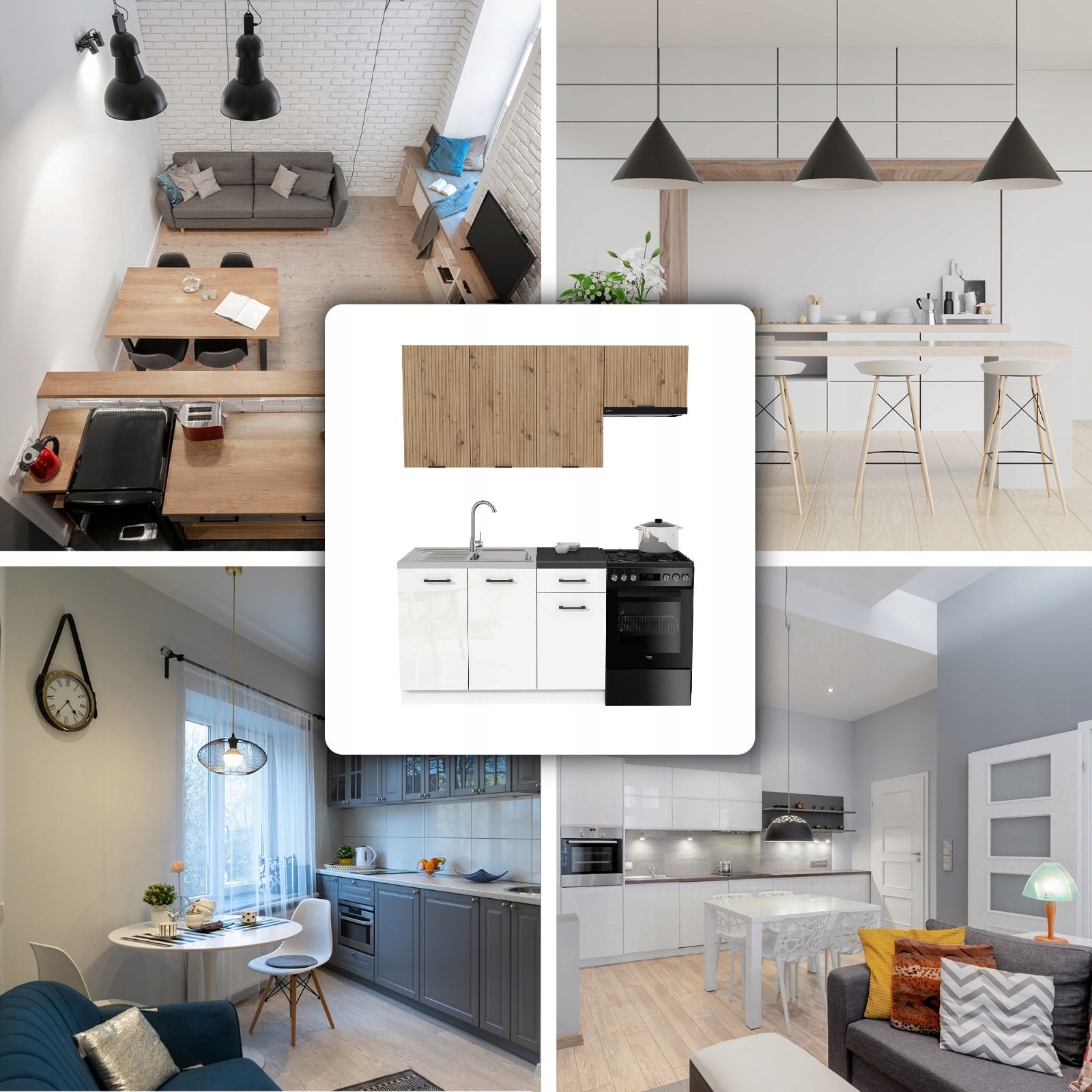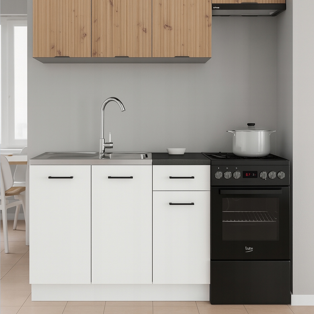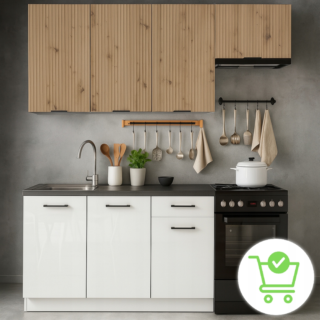 Kuchnia MODERN to nowoczesne i praktyczne rozwiązanie dla osób szukających funkcjonalnego zestawu kuchennego o kompaktowych wymiarach i estetycznym wyglądzie. Idealna dla tych, którzy chcą uniknąć długiego oczekiwania i skomplikowanego projektowania.