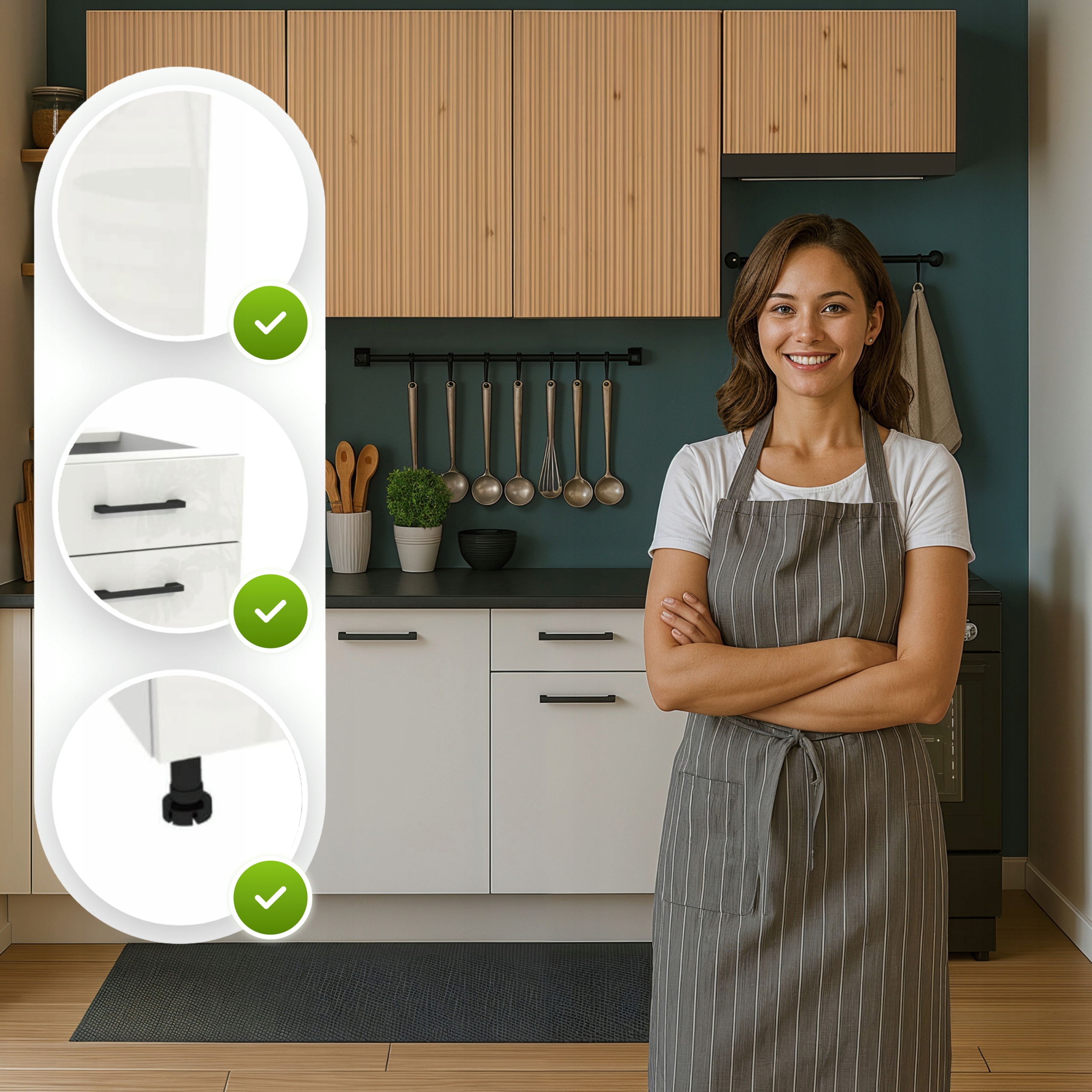 Przeglądając inne oferty zwróć uwagę na fronty, korpusy, zawiasy i prowadnice. Nasze zestawy zrobione są z płyty laminowanej (MDF lub wiórowa), która jest łatwa do czyszczenia, odporna na umiarkowaną wilgoć i zarysowania i tańsza niż lite drewno, ale wystarczająca na codzienne użytkowanie. W standardzie posiada też cichy domyk, co wydłuża żywotność mebli.