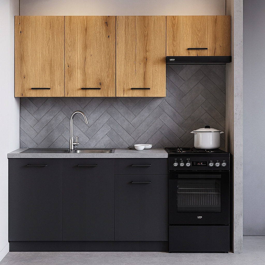 Kuchnia MODERN to nowoczesne i praktyczne rozwiązanie dla osób szukających funkcjonalnego zestawu kuchennego o kompaktowych wymiarach i estetycznym wyglądzie. Idealna dla tych, którzy chcą uniknąć długiego oczekiwania i skomplikowanego projektowania.