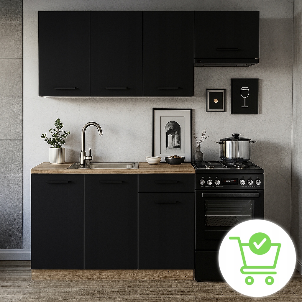 Kuchnia MODERN to nowoczesne i praktyczne rozwiązanie dla osób szukających funkcjonalnego zestawu kuchennego o kompaktowych wymiarach i estetycznym wyglądzie. Idealna dla tych, którzy chcą uniknąć długiego oczekiwania i skomplikowanego projektowania.