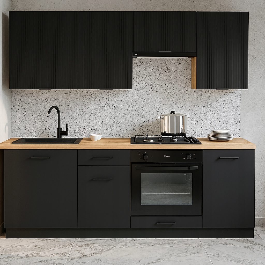 Kuchnia MODERN to nowoczesne i praktyczne rozwiązanie dla osób szukających funkcjonalnego zestawu kuchennego o kompaktowych wymiarach i estetycznym wyglądzie. Idealna dla tych, którzy chcą uniknąć długiego oczekiwania i skomplikowanego projektowania.