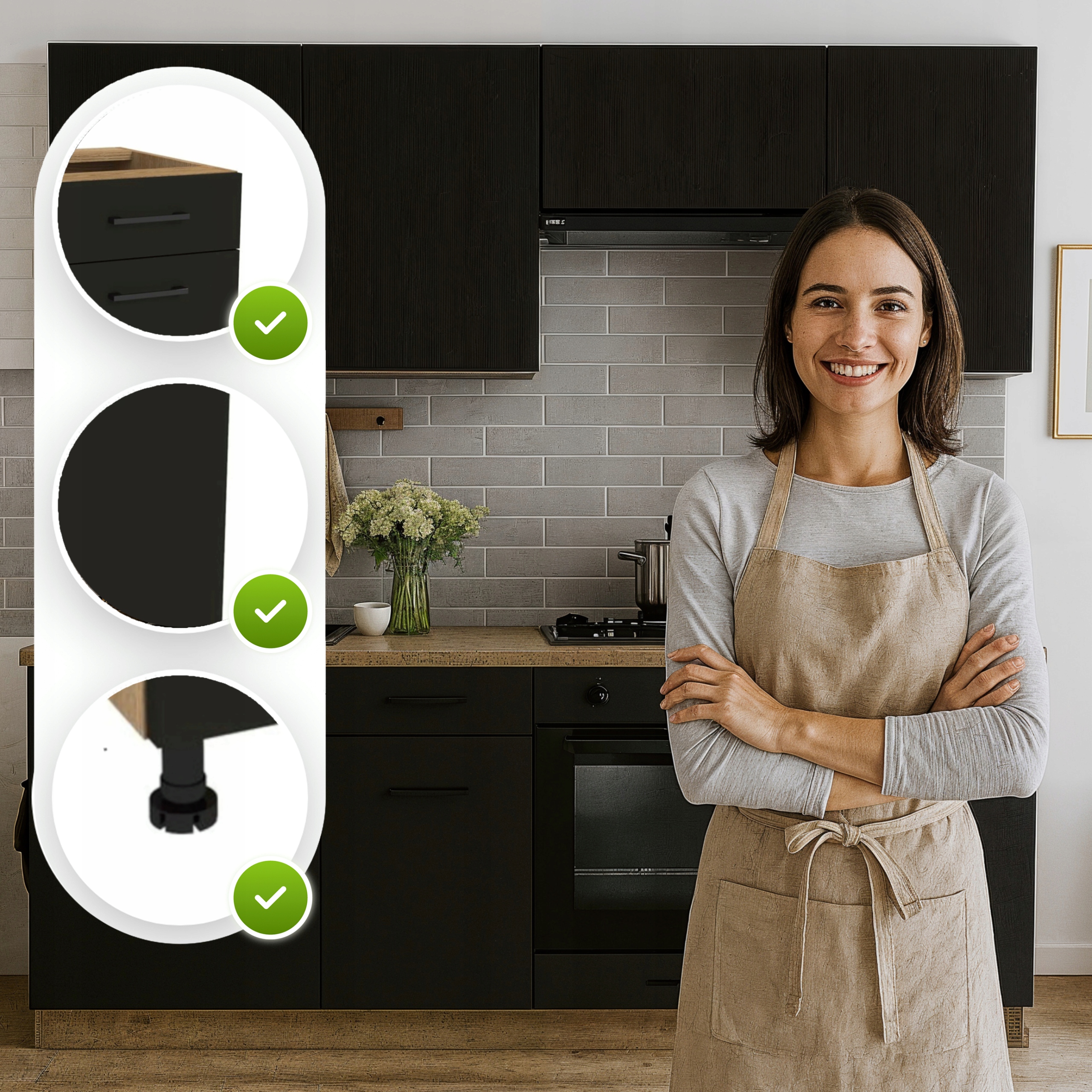 - Regulowane nóżki – dolne moduły posiadają nóżki z regulacją wysokości, które umożliwiają stabilne ustawienie mebli nawet na nierównym podłożu.
