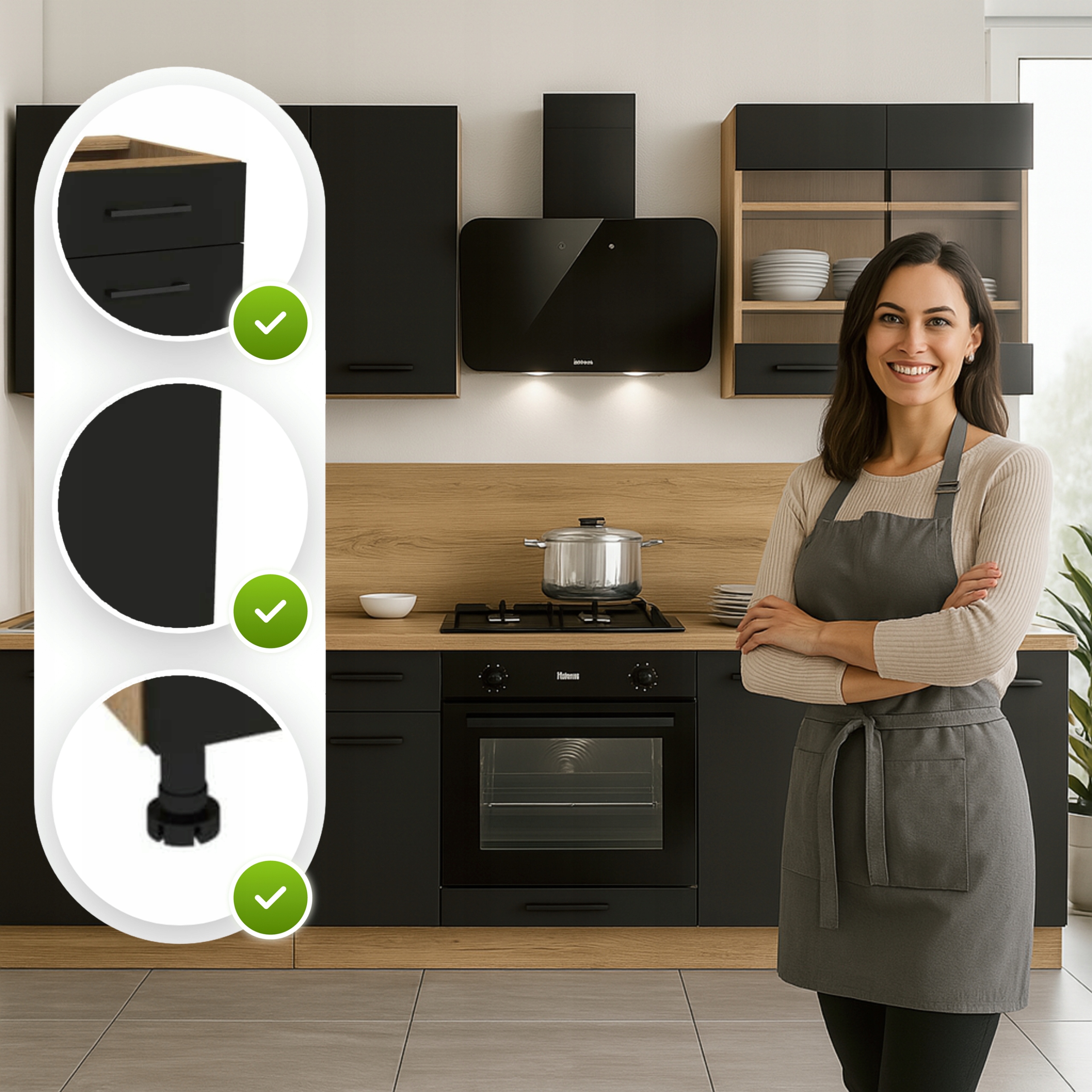 - Regulowane nóżki – dolne moduły posiadają nóżki z regulacją wysokości, które umożliwiają stabilne ustawienie mebli nawet na nierównym podłożu.