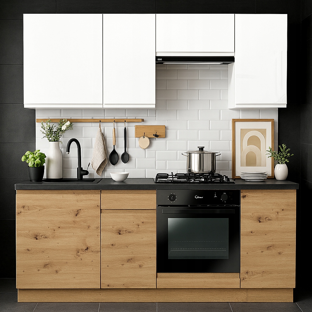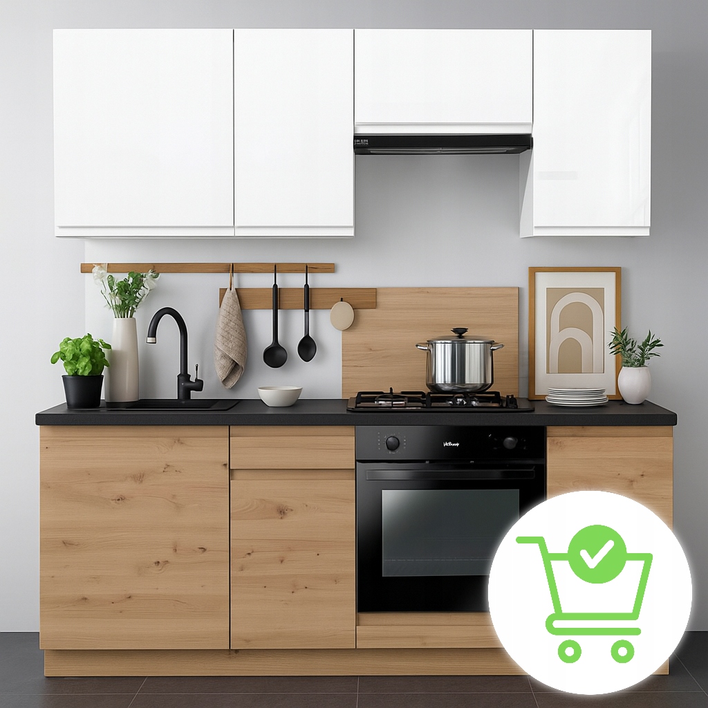 Kuchnia MODERN to nowoczesne i praktyczne rozwiązanie dla osób szukających funkcjonalnego zestawu kuchennego o kompaktowych wymiarach i estetycznym wyglądzie. Idealna dla tych, którzy chcą uniknąć długiego oczekiwania i skomplikowanego projektowania.