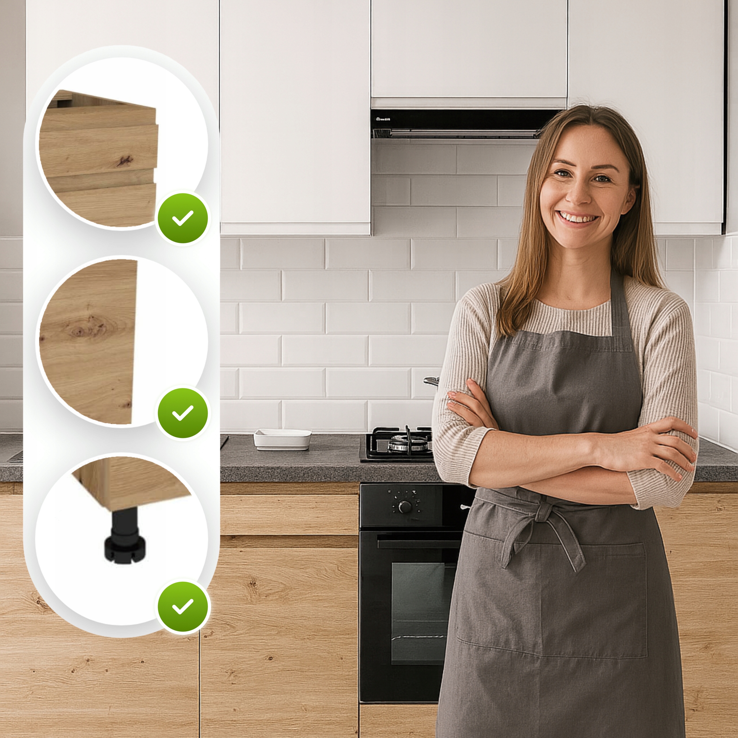 Przeglądając inne oferty zwróć uwagę na fronty, korpusy, zawiasy i prowadnice. Nasze zestawy zrobione są z  płyty laminowanej (MDF lub wiórowa), która jest łatwa do czyszczenia, odporna na umiarkowaną wilgoć i zarysowania i tańsza niż lite drewno, ale wystarczająca na codzienne użytkowanie. W standardzie posiada też cichy domyk, co wydłuża żywotność mebli.